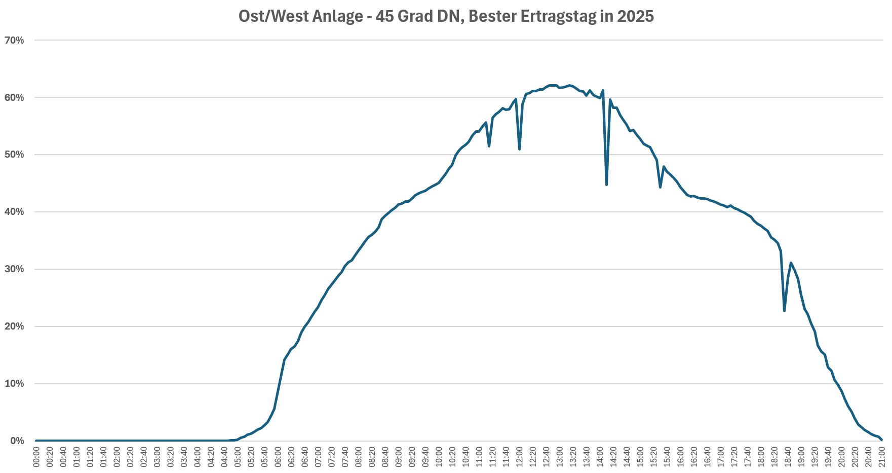 Bei meiner Ost/West Anlage sind es am bisher besten Tag des Jahres 2025 (ohne irgendwelche Abregelungen) 62% der installierten Modulleistung. Unser Netzanschluss ist für 70% der Modulleistung ausgelegt.