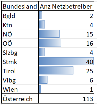 Vom Regulator wurde 2024 zum ersten mal die Zinsthematik umgestellt. Sonst immer vergangenheitsbasierend, aufgrund des volatilen Kapitalmarktes gibt es jetzt einen ex-ante Ansatz. WACC (Weighted Average Cost of Capital) Beta ist ein Risikomaß aus dem Capital Asset Pricing Model (CAPM). Es zeigt, wie stark die Rendite einer einzelnen Anlage mit den Renditen des Gesamtmarkts schwankt. Der hohe EK Zinssatz birgt nach Averch-Johnson (Nobelpreisträger) das Risiko, daß der Netzbetreiber im regulatorisch anerkannten Anlagebereich mit Eigenkapital "überinvestiert" (landläufig als "vergolden" bezeichnet), da jeder ausgegebene Euro eine höhere Verzinsung als am allgemeinen Markt bringt. Also Geld für Dinge ausgibt, die keine optimale Kapitalallokation darstellen. Das kann man vielfältig gestalten, mit zBsp besonders hohen Redundanzanforderungen, Reservekapazitäten, etc ... Interessant wäre sich anzusehen, wie die tatsächliche Verteilung EK zu FK bei den Netzbetreibern aussehen. Der Regulator hat 40:60 in seinem Modell. Ist der EK Anteil unter 36%, wird bei dem Netzbetreiber der tatsächliche Prozentsatz der Verteilung angesetzt. Ist der EK Anteil über 40% gibt es keine entsprechende Klausel in der Verordnung (und der NB kann den Zinsgewinn mitnehmen) Zum Abschluss: Die Anzahl der Netzbetreiber pro Bundesland |