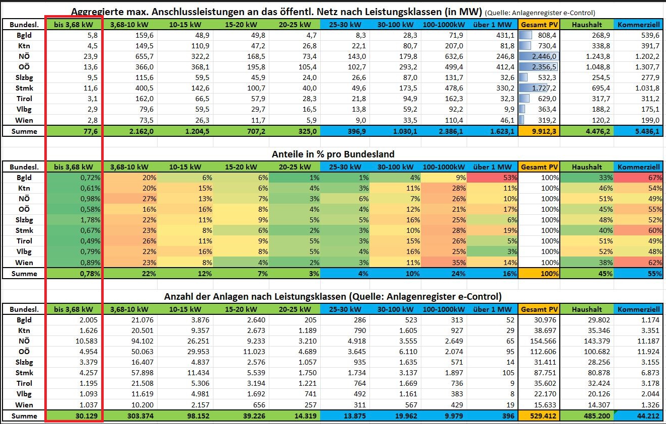 Also 77,6 MW Anschlussleistung von derzeit 9900 MW PV Anschlussleistung sind nach diesem kolportierten Vorschlag im Standard befreit, bzw. ca. 30.000 von 485.000 privaten Anlagen (6,2%).