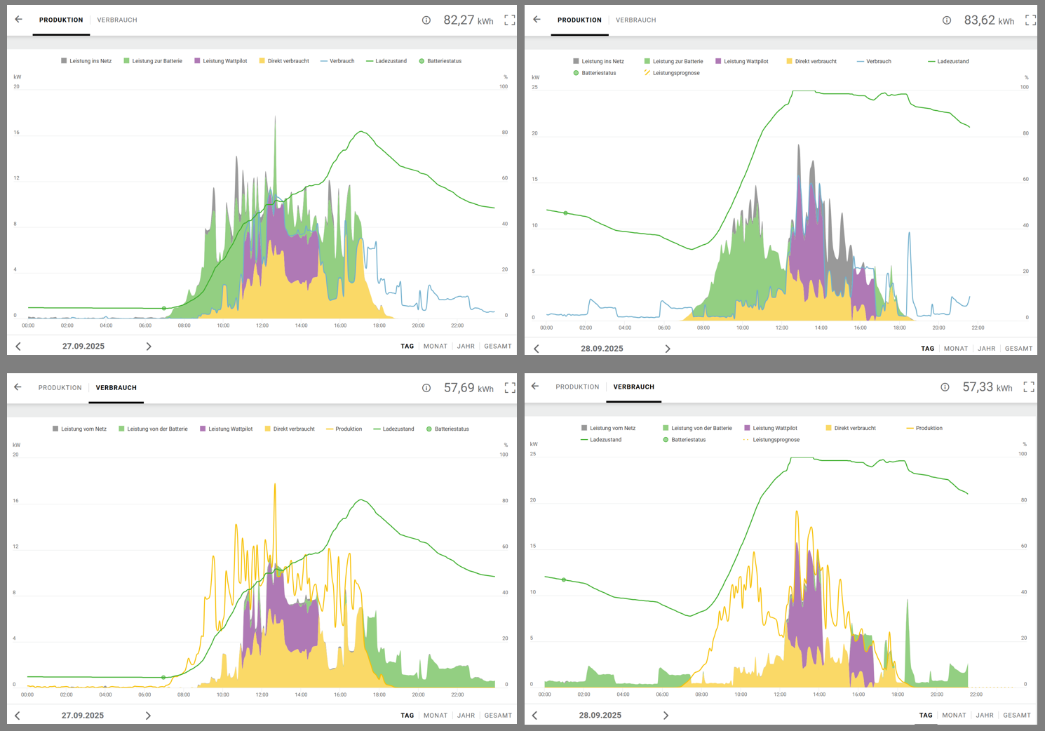 2 Antworten: 1) Mein Wohnhaus (auf das sich mein obiger Post bezieht). Im Sommer kann es natürlich den Überschuss in die BEG abgeben, aber wenn das Wetter schlechter wird, steigt der Eigenverbrauch (bevor der Überschuss für die BEG ins Netz gestellt wird): 2 Wohnungen im Haus, 2 Homeoffice Plätze, Sauna (wird abends komplett aus der Batterie abgedeckt), eAuto, Durchlauferhitzer, Boiler, Schwimmbadpumpe, 11 kW Wallbox Seit ein paar Monaten kam eine Warmwasser WP WP [Wärmepumpe] (statt Durchlauferhitzer) + eine Heizungs LW WP WP [Wärmepumpe] dazu. Voriges Jahr hatten wir in vielen Monaten eine monatliche Spitzenleistung von 16-19 kW (meistens ein einzelner höchster 15min Wert im Monat), seit die überschussgesteuerte Wallbox seit Jahresanfang und jetzt die WP WP [Wärmepumpe] da sind, bleiben wir unter 4 kW. Die große Batterie glättet auch mehrere Tage schön aus. Der Batterieverlauf in den 4 Tagen Schlechtwetter vorige Woche (Einschränkung für die Familie: keine Sauna ![]() ![]() und die 2 Tage danach, um wieder alles aufzufüllen. ![]() heute ist wieder ein normaler Tag (Stand 13:00) ![]() 2) Die BEG direkt. Es gibt in Summe 4 WP WP [Wärmepumpe] und 2 BEVBEV [Battery Electric Vehicle, Elektroauto], aber die gehen im Frühjar/Sommer im Grundrauschen unter, da ein Unternehmen alles abnimmt, was wir in der BEG nicht selber brauchen. Der 20.9. war ein besonders "schöner" Tag für Eigenverbrauch und Autarkie in der EG ![]() (Es ist relativ leicht, einen der beiden Werte Eigenverbrauch und Autarkie in einer EG recht hoch zu bekommen, aber deutlich schwerer beide gleichzeitig. Daher die Freude .....) ![]() LG |