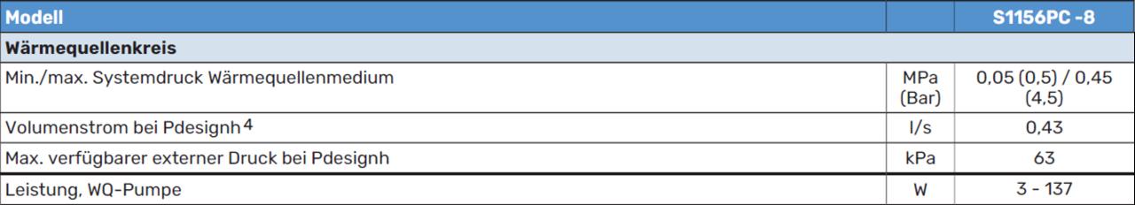 Hallo, ich plane in kommendem Jahr meine aktuelle WP WP [Wärmepumpe] zu ersetzen und mein Favorit ist bisher die S1156-PC-8. Jetzt hat mich doch der Punkt mit der Solepumpe etwas verunsichert, da ich eine Bohrung von 1x120m mit 32er Leitung habe. In Bezug auf die Solepumpe habe ich im aktuellen Datenblatt folgendes gefunden: