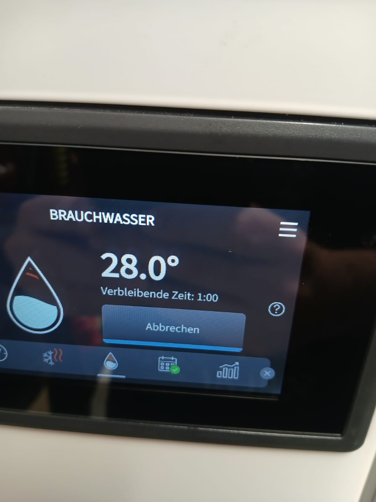 Danke für eure Antworten! ja das stimmt vermutlich, aber ist leider schon zu spät 🙈 Ja ist natürlich nur eine Spielerei, aber die ganzen Temperaturen und ob gerade geheizt, gekühlt oder WW WW [Warmwasser] produziert wird ist schon auch interessant -> halt nur Werte auslesen. Zum einstellen habe ich tatsächlich nur die Heiz und Kühlkurven Verschiebung visualisiert. Ansonsten möchte ich auch "mehr Warmwasser" integrieren um bei Bedarf (wenn wir die Badewanne einfüllen) nur einen taster drücken muss. Ja die habe ich eh im Zeitprogramm der WP WP [Wärmepumpe] hinterlegt, hat aber trotzdem nicht funktioniert. Ja genau Greenwater Ich habs jetzt so eingestellt und die WP WP [Wärmepumpe] hat dann auch tatsächlich nicht mehr begonnen zu heizen als der BT6 schon unter 30°C war 👍 Werde das ganze die nächsten Tage noch beobachten. Den Unterschied verstehe ich allerdings eigentlich nicht. 🙈 Aber wenns dann wirklich funktioniert ists mir auch egal ob ichs verstehe oder nicht 😂 Problem 1 ist somit hoffentlich behoben 🙏 ok habs jetzt auch genau so gemacht, die WP WP [Wärmepumpe] hat mir dann 5 sekunden folgendes angezeigt: danach war die Zeitangabe weg und hat dann bis auf 45°C aufgeheizt, das wäre dann meine Stopp Temp mittel. Eigentlich sollte aber bis Stopp hoch (bei mir 49°C) geheizt werden oder? Die Abstand Wiederholung Einstellung von 3600 habe ich auch übernommen, die dürfte aber nicht wirklich funktionieren da bei neuerlichem druck der loxone taste das signal wieder bei der WP WP [Wärmepumpe] angekommen ist. Aber das ist ja eigentlich auch nicht relevant... @ds50: danke dir ganz besonders für deine Hilfe (auch schon im anderen Beitrag), ich glaube ich Schulde dir eine Kiste Bier 😉 |