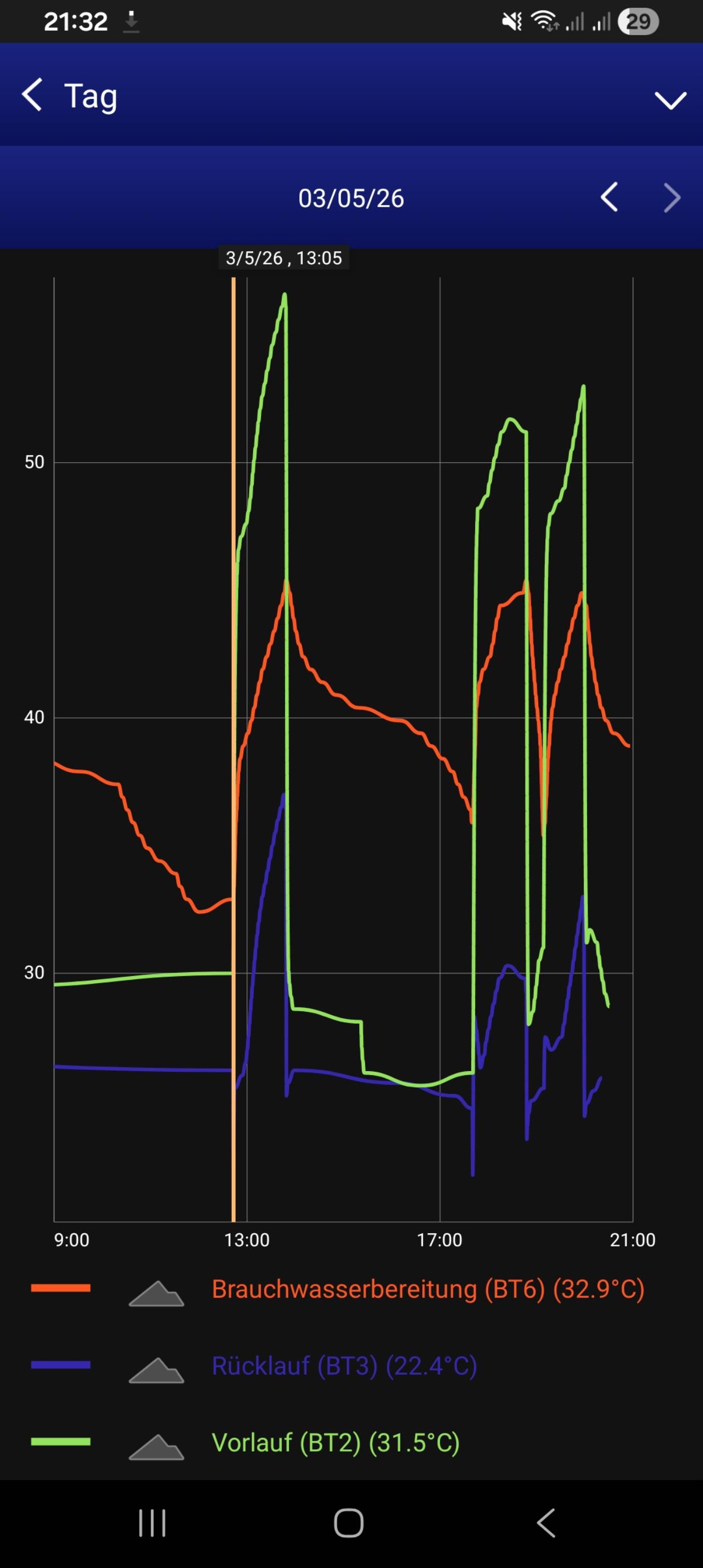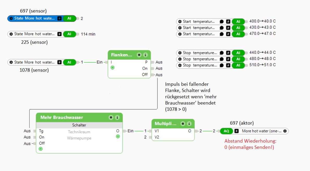 Ich schicke einfach einen (5 sekunden langen) Impuls: ![]() ![]() Aus eigener Erfahrung funktioniert das "mehr Brauchwasser" NICHT, wenn der BT6 einen relativ hohen Wert hat, also nahe der Stopptemperatur ist. |