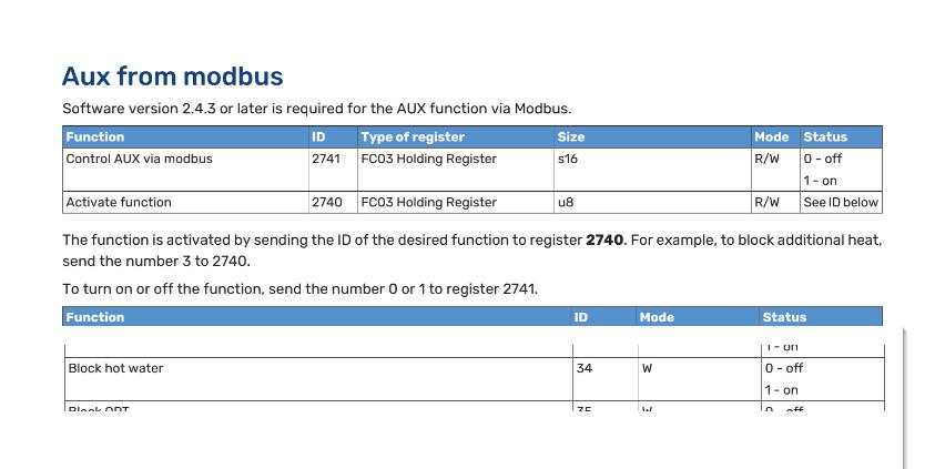 Laut doku musst du die ID 34 auf 2740 setzen, nicht die 2. Ich habe das aber nicht getestet. Ich kann dir die Nibe doku senden, die darin enthaltene Registerliste ist aber nicht vollständig - die vollständige Liste kannst du aber direkt von deiner WP WP [Wärmepumpe] exportieren. Die Nibe doku kannst auch hier herunterladen: https://professional.nibe.eu/en-se/documents/documents/documents |