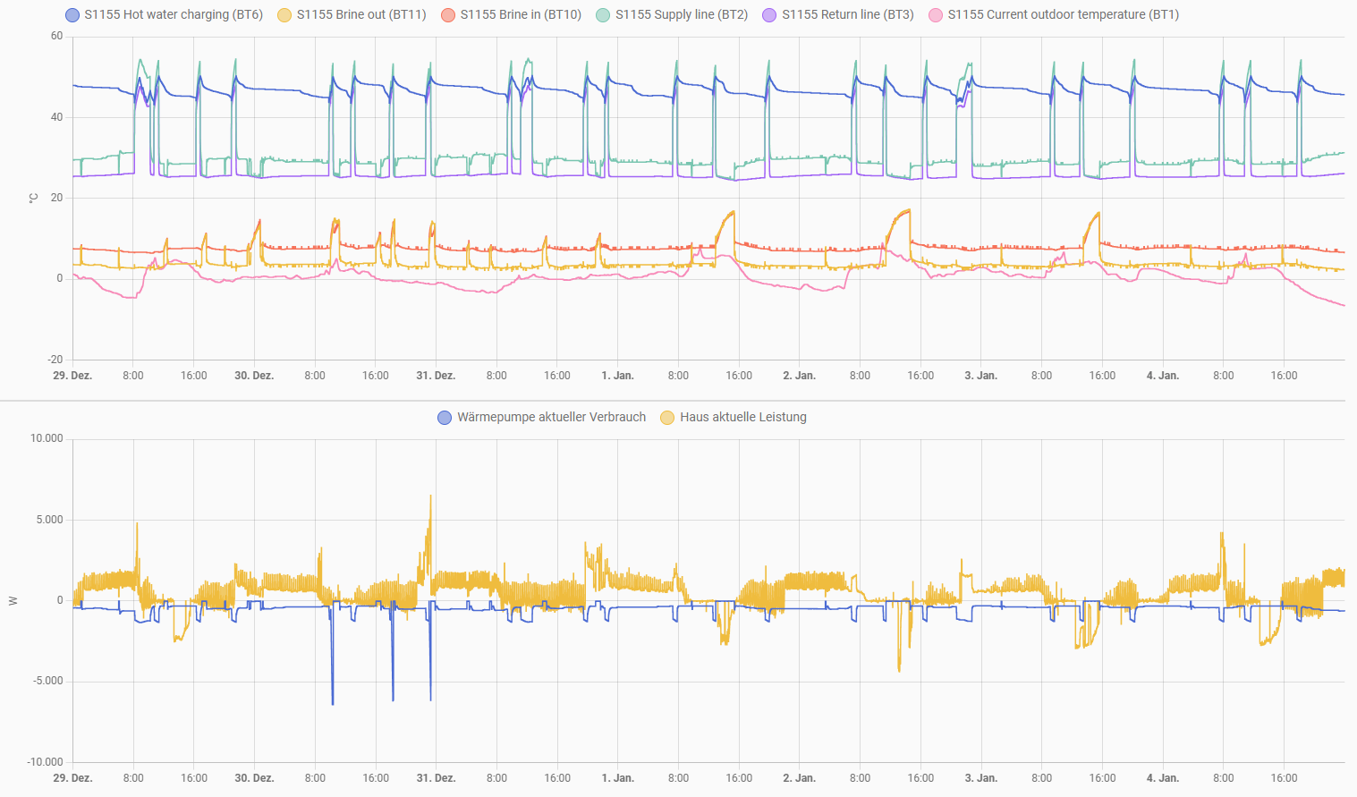 Hier die Detailansicht mit BF1 und Frequenz für 2 WW WW [Warmwasser]-Phasen am 30.12. Beim ersten mal mit, beim zweiten mal ohne Heizstab. Mir fällt nichts komisches auf.