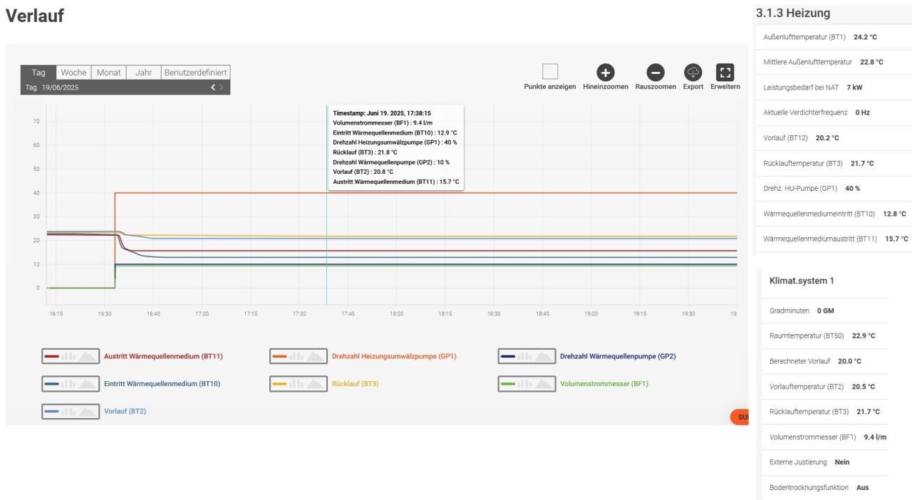 Die Heizkurve ändert das Kühlverhalten, bzw. genauer die VL VL [Vorlauf] Temperatur in Abhängigkeit zur Außentemperatur. Ich nehme an, 1.30.5 "Min Vorlauf Kühlen" ist auf 20°C eingestellt, deswegen siehst du nur einen Strich. Bei z.B. 18°C würdest du einen anderen Verlauf mit eben minimum 18°C VL VL [Vorlauf] sehen, je nach Heizkurve. Um generell die Heizkurve zu verstellen (immer zu kalt im Haus) würde ich eher die Parallelverschiebung anpassen, d.h. mit +1 eher auf 21°C VL VL [Vorlauf] gehen, falls zu kühl. Oder die Tipps unten beachten. Ich spiele mich eher mit einem höheren Kühlstart, um Pausen beim Kühlen zu erzeugen. Letzteres. Ersteres. Da führen mehrere Wege nach Rom: - Min. Vorlauf erhöhen - Kühlkurvenparallelverschiebung erhöhen (s.o.) - Kühlstart erhöhen (s.o.), mit Filterzeit spielen. Bei einer Tiefenbohrung? Wohl kaum. Mein RGK RGK [Ringgrabenkollektor] wird gegen Ende des Sommers auch recht warm. Dann erhöhe ich halt: - Pumpengeschwindigkeit (GP1 bzw. auch GP2) - Laufzeit (also Senkung des Kühlstarts) - aktivierte Fläche (FBH zusätzlich zur BKA BKA [Betonkernaktivierung] dazuschalten = doppelte Kühlfläche) Mit all den Boosts geht es sich dann doch locker aus bis zum Herbst, selbst wenn ich nur mehr 21°C VL VL [Vorlauf] zusammenbringe. Probieren geht über studieren. |