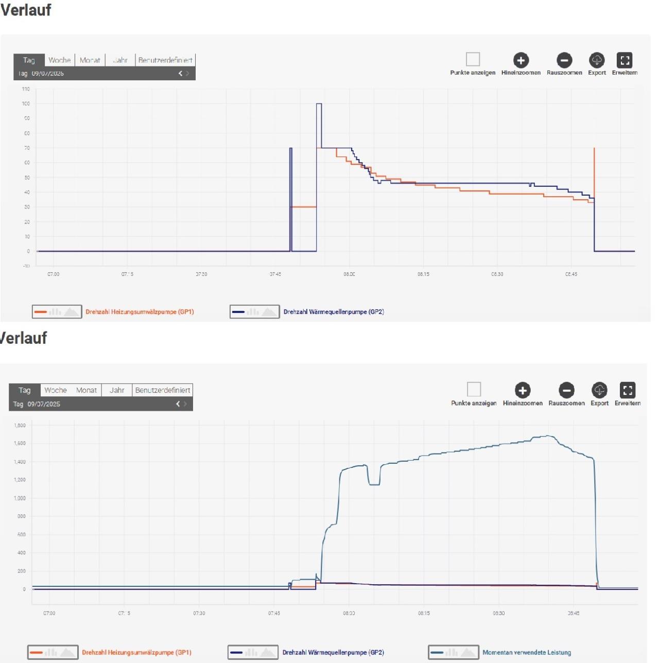 Ich wollte mal nachsehen, ob die WP WP [Wärmepumpe] aktuell noch kühlt. Außentemperatur derzeit nämlich nur zw. 13 und 21°C. Die Kurven sehen so aus. Siehe Bild. Leistung um die 1500W kann aber keine Kühlung sein, oder? Dann wird sie wohl wieder geheizt haben. Aber wie kann ich sehen, ob es Kühlung oder Heizung war? Pumpendrehzahlen helfen da ja nicht. |