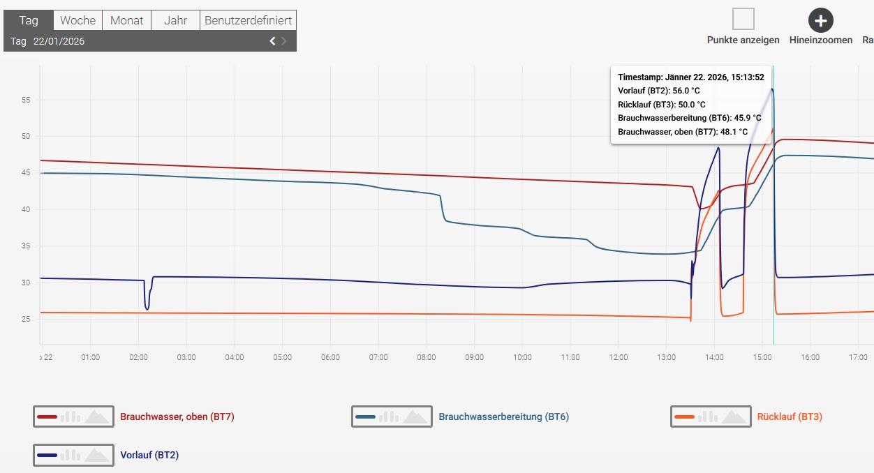 Du hast Dich damals ja bestimmt auf BT2 ud BT3 bezogen. Ich habe bisher immer nur auf BT6 und BT7 geschaut. Mein Zeitprogramm ist von 13:30 bis 15:30 Uhr. Komisch, dass da zwei WW WW [Warmwasser]-Bereitungen kurz hintereinander laufen, oder? Ist Dir das Delta zw. BT2 und BT3 zu wenig und auch deren Temperaturen zu hoch? Ich weiß eigentlich immer noch nicht, was ich machen sollte. |