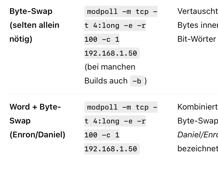 ChatGPT sagt: Alles klar 👍 – hier ein Beispiel, wie du in **modpoll 3.11** ein **32-Bit Integer** (also *long*) mit **Word Swap** liest: --- ### 🛠 Beispielbefehl ```bash modpoll -m tcp -t 4:long -i -r 100 -c 1 192.168.1.50 ``` --- ### 🔎 Erklärung * `-m tcp` → Modbus TCP als Protokoll (bei RTU wäre z. B. `-m rtu -b 19200 …`) * `-t 4:long` → Datentyp: 32-Bit Integer („long“) aus Holding-Registern (`4`) * `-i` → aktiviert **Word Swap** (big-endian Reihenfolge der 16-Bit-Register) * `-r 100` → Start bei Registeradresse 100 * `-c 1` → 1 Wert lesen (belegt 2 Register) * `192.168.1.50` → IP-Adresse deines Modbus-Geräts --- 👉 Falls dein Gerät statt Word-Swap auch noch **Byte-Swap** innerhalb der Register macht, müsstest du statt `-i` evtl. mit `-e` (Enron/Daniel-Format) testen. Willst du, dass ich dir eine kleine **Vergleichstabelle mit allen möglichen Swaps für 32-Bit Int** baue (Standard, Word-Swap, Byte-Swap, beides), sodass du sie direkt ausprobieren kannst? Perfekt 🦉 – hier eine kleine Übersicht, wie du in **modpoll 3.11** ein **32-Bit Integer (long)** aus Holding-Registern lesen kannst, je nach *Swap-Variante*. --- |