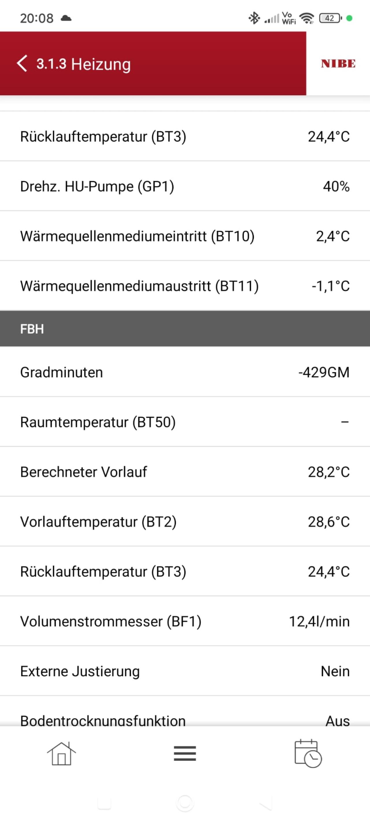 Seit geraumer Zeit habe ich das Thema, dass die Gradminuten immer bei ca -430 herumdümpeln und die real gemessene Vorlauftemperatur immer ein paar Zehntel über der berechneten liegt. Hat das schon mal jemand von euch beobachtet?