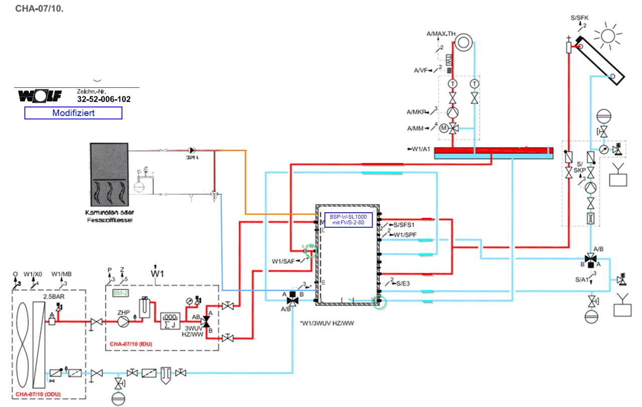 Was mir sehr gut an dem WOLF-Konzept gefällt, ist der Schichtenspeicher BSP-W-SL1000 mit FRIWA von denen. Hier das entsprechende Hydraulikschema. Zu beachten ist auch, dass der Heizkreis per T-Stück an den Speicher hängt, so dass wenn der Volumenstrom im HKR ausreichend ist, der Speicher nicht geladen wird.