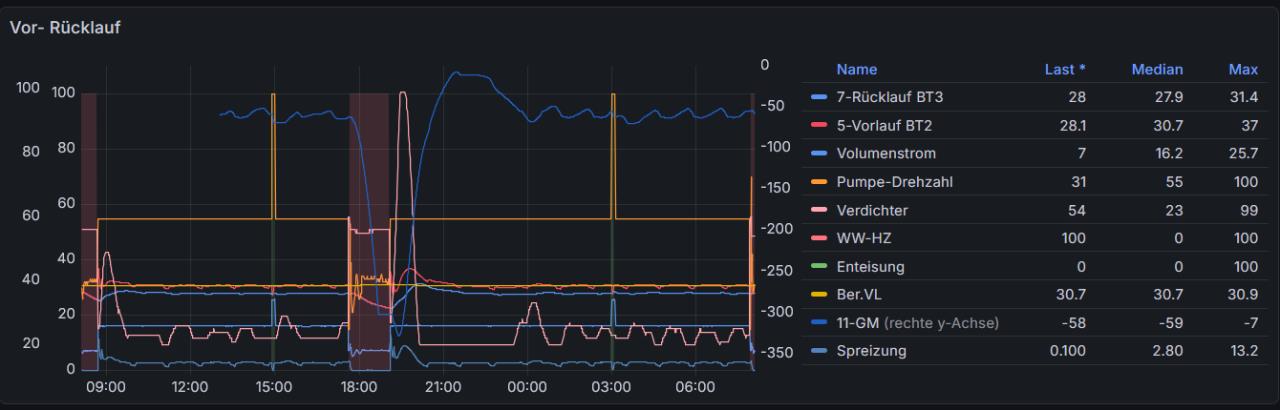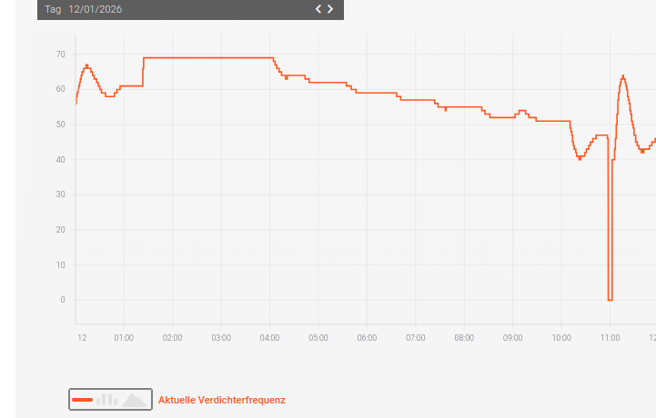 Bei 12:35 siehst du das die WW WW [Warmwasser] Bereitung angefangen hat, die Temperatur erst abfällt, dann wurde enteist, erst danach geht die Temperatur steil hoch. In der unteren Grafik siehst du wie der Verdichter danach immer sofort auf 100% geht.