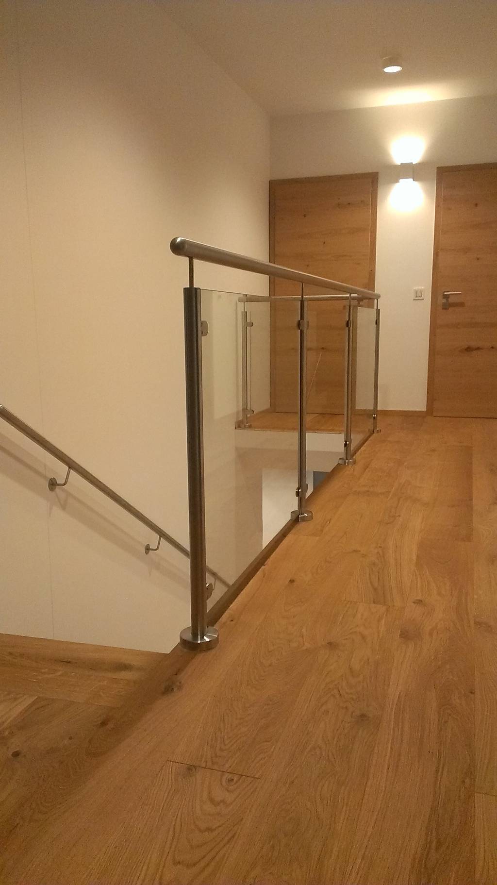 Erfahrungswerte: ohne der hinteren Punkt-Halterung an der Säule war es mir zu wackelig. Ein Handlauf aus Edelstahl ist nicht notwendig, die Haptik ist ok. Das Glas ist nichts für Sauberkeits-Fanatiker, hier sieht man jeden Fingerabdruck drauf. Ich musste aber Glas nehmen, damit Licht in den Flur unten kommt.