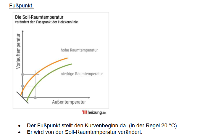 Ja, dass sind die super Erkärungen von den Fachleuten😀 Der Fußpunkt ist jene Aussentemperatur, bei der die Regelkennlinie beginnt. D.h. oberhalb vom Fußpunkttemperatur schaltet die Steuerung die Heizung ab, bzw. hält die VLT bei den eingestellten 20° Celsius. Bei der TEM Steuerung heißt dieser Punkt Heizgrenze. Als diese noch aktiv war, habe ich die Heizgrenze (Fußpunkt) auf 17° Celsius gesetzt, da ich bei dieser AT AT [Außentemperatur] keine Heizung mehr brauche. Und wichtig, der Fußpunkt ist die obere AT AT [Außentemperatur]. Bei manchen 2-Punkt Reglern verschiebt sich der Fußpunkt auch mit der Soll.Innentemperatur. Gibt viel Literatur über Heizkurven/-kennlinien. https://www.gwbs.de/fileadmin/user_upload/erdgas/infomaterial/Erkl%C3%A4rung_Heizkennlinie.pdf https://www.shk-frankfurt.de/fileadmin/ONS/Files/Fachregel_Optimierung_von_Heizungsanlagen_im_Bestand.pdf |