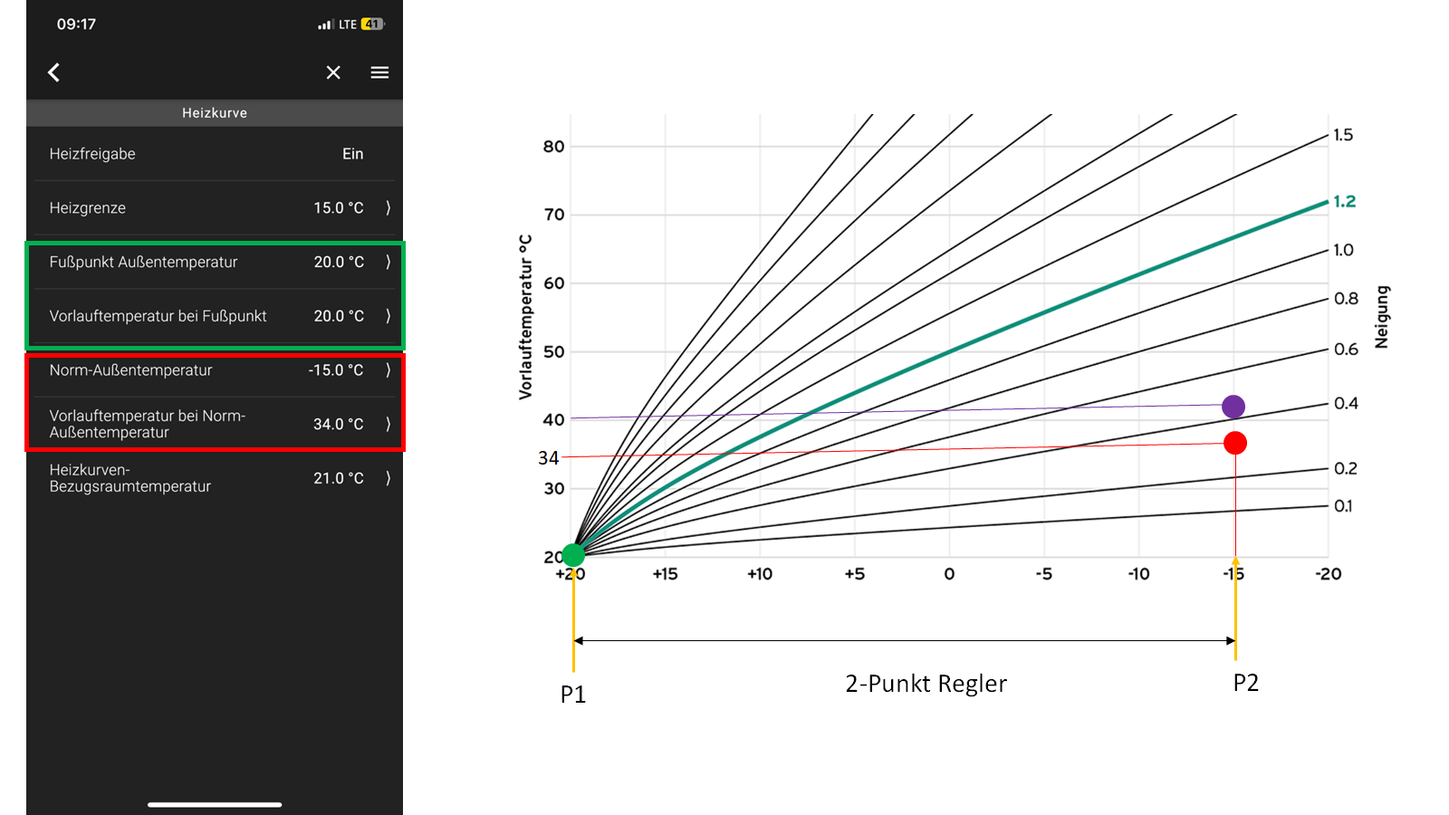 Nein, der Fußpunkt passt schon. Im Prinzip ist das 2-Punktregler. Mit dem Fußpunkt (P1) und der Norm-Aussentemperatur (P2) wird der Regelbereich definiert. Die Heizkurven Bezugstemperatur hat auch immer unterschiedliche Bedeutungen. Bei dieser Steuerung sollte man diese als gewünschte Raumtemperatur (ich gehe davon aus, wenn kein Raumtemperaturfühler vorhanden ist) stellen. Ich würde diese Änderungen vornehmen und dann beobachten, wie sich das System verhält. 1) VL-Temp bei Norm-Aussentemperatur von 34° auf 40° Celsius stellen 2) Bezugstemperatur von 21° auf 23° Celsius stellen. Es gibt bei dieser Steuerung auch Default-Werte. Vielleicht ist die thermische Hülle von deinem Haus doch nicht so gut. Auf 55° Celsius würde ich die Vorlauftempertaur nicht stellen, ohne die Hydraulik im Detail zu kennen. Ich fahre in die FBH FBH [Fußbodenheizung] (dient als Pufferspeicher) mit max. 41-42° Celsius hinein. Möchte nicht, dass die Steinbeläge durch die zu hohe Temperatur Risse bekommen. Aber bei einer Raumtemperatur von 19,4° Celsius möchte ich den Blick von der Chefin nicht sehen. 😊 |