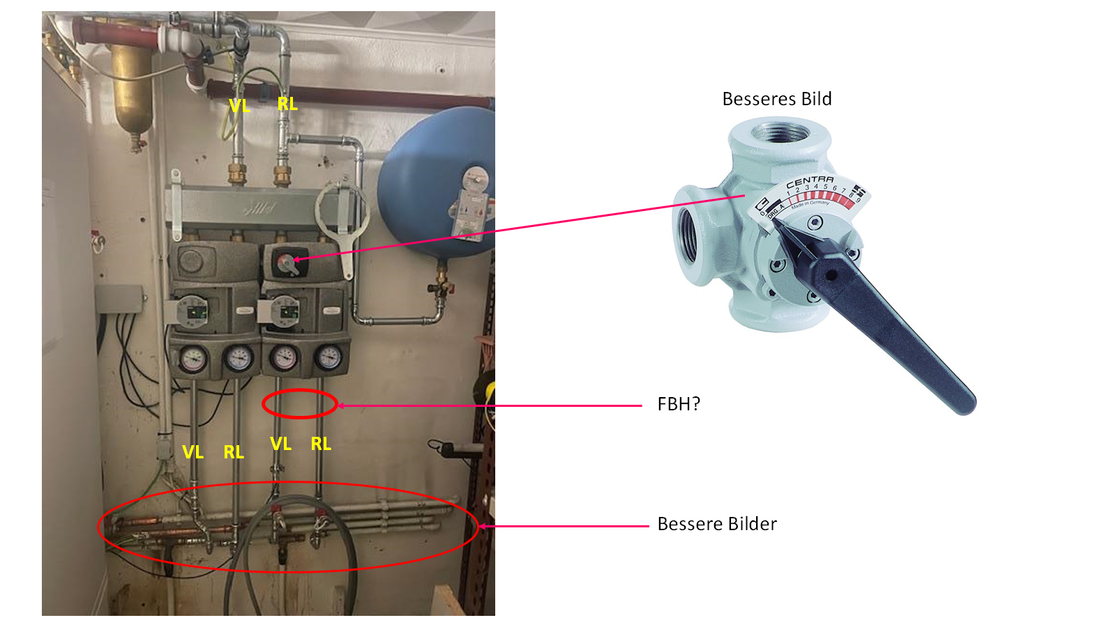 Guten Morgen, konnte gestern keine Beiträge mehr schreiben. Danke für Eure Beiträge. Die Anlage ist ein Ochsner Multitower inkl Verdampfer 8-10 kw. Es gibt einen Innenraumthermostat wegen der Möglichkeit der Raumkühlung im Sommer, Eingebaut wurde auch ein Modulares Verteilersystem welches die beiden Heizkreise (Radiatoren im Keller, die mit 10 Grad laufen und die FBH FBH [Fußbodenheizung]) besser trennen soll. Gesamte Fläche inkl Ratiatoren Keller sind 132 m2. Ansonsten kann ich die FBH FBH [Fußbodenheizung] nur mit drehern an dem Verteilersystem selbst auf wärmer oder kalt stellen, aber da sind eigentlich alle Ventile ganz offen, bis auf 1 Schlafzimmer ( da ist der Regler auf dreiviertel gedreht). Grad kann ich da keine einstellen, das System ist von 1989, da geht nur Pfeil (rot) warm oder Pfeil (blau)kalt Vielleicht ist dieses Prinzipschema hilfreich und die Fotos der Anlage mit Verteilerkreis, sowie dem Innenthermostat. @Kleinermuk: ich bin die Chefin 🙃 mein mann ist kein techniker 😉 Danke euch!! Vielleicht gibts ja noch aufschlussreiche Beiträge aufgrund der Zusatzdaten. Wie gesagt die Professionisten sind da leider auch wenig aufschlussreich. |