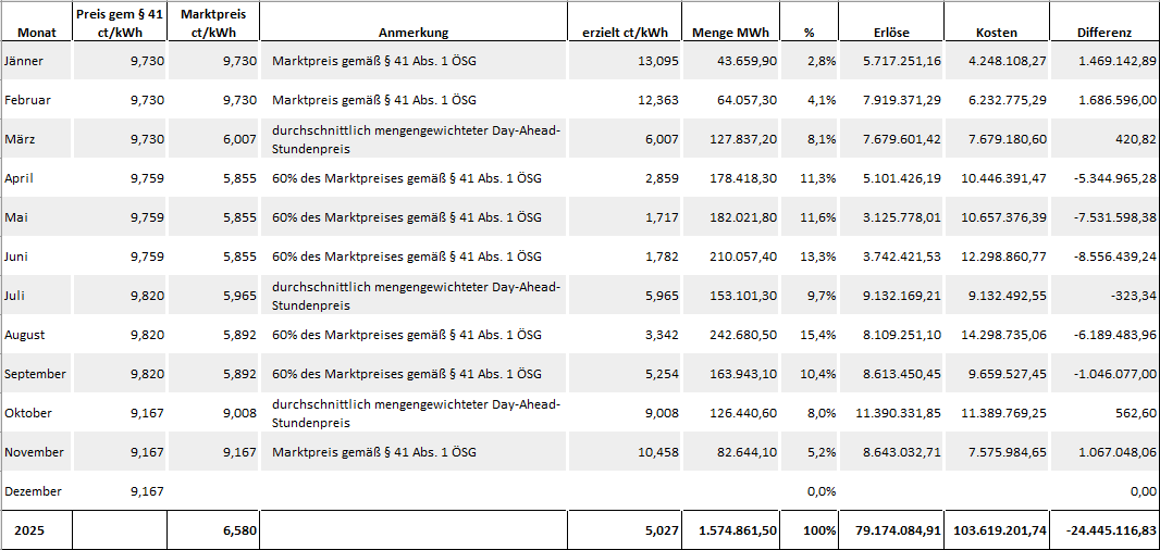 Im November beträgt der Marktpreis erwartungsgemäß das Maximum von 9,167 ct/kWh, die OeMAG hat im November über 1 Mio mit der Vermarktung "verdient". |