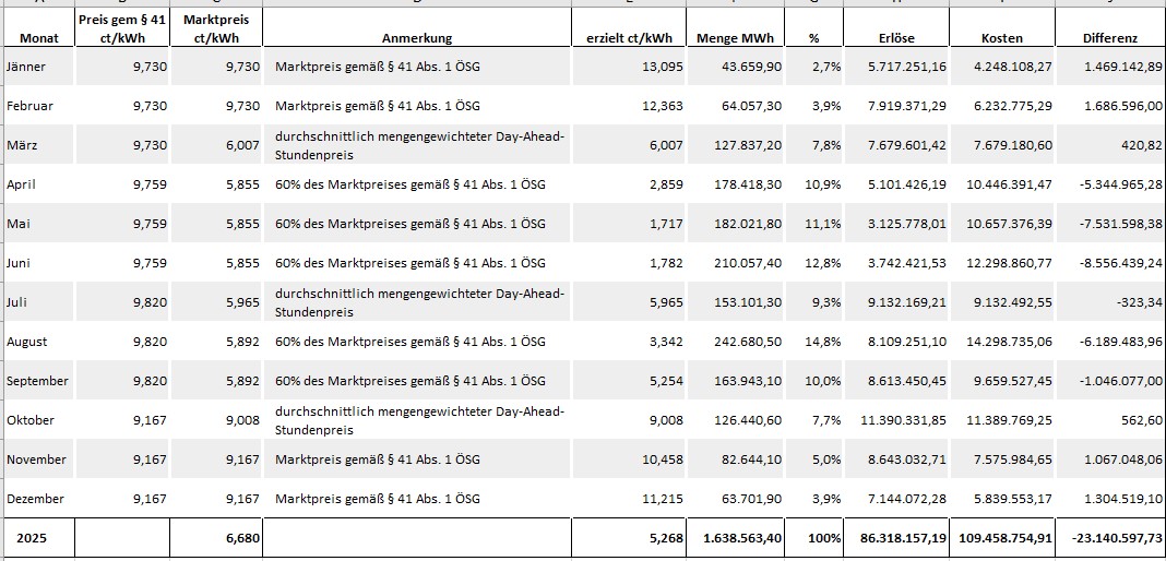 Die finalen Daten von 2025. Dass der finale Preis im Dezember dem Marktpreis entspricht ist keine Überraschung, interessant ist, dass der durchschnittliche Preis (gewichtet nach den Mengen der OemAG) 6,68 ct/kWh betrug, erzielt hat die OeMAG 5,268 ct/kWh, somit betrugen die Netto-Kosten 23,14 Mio EUR, eigentlich nicht viel finde ich. |