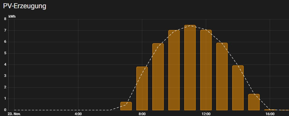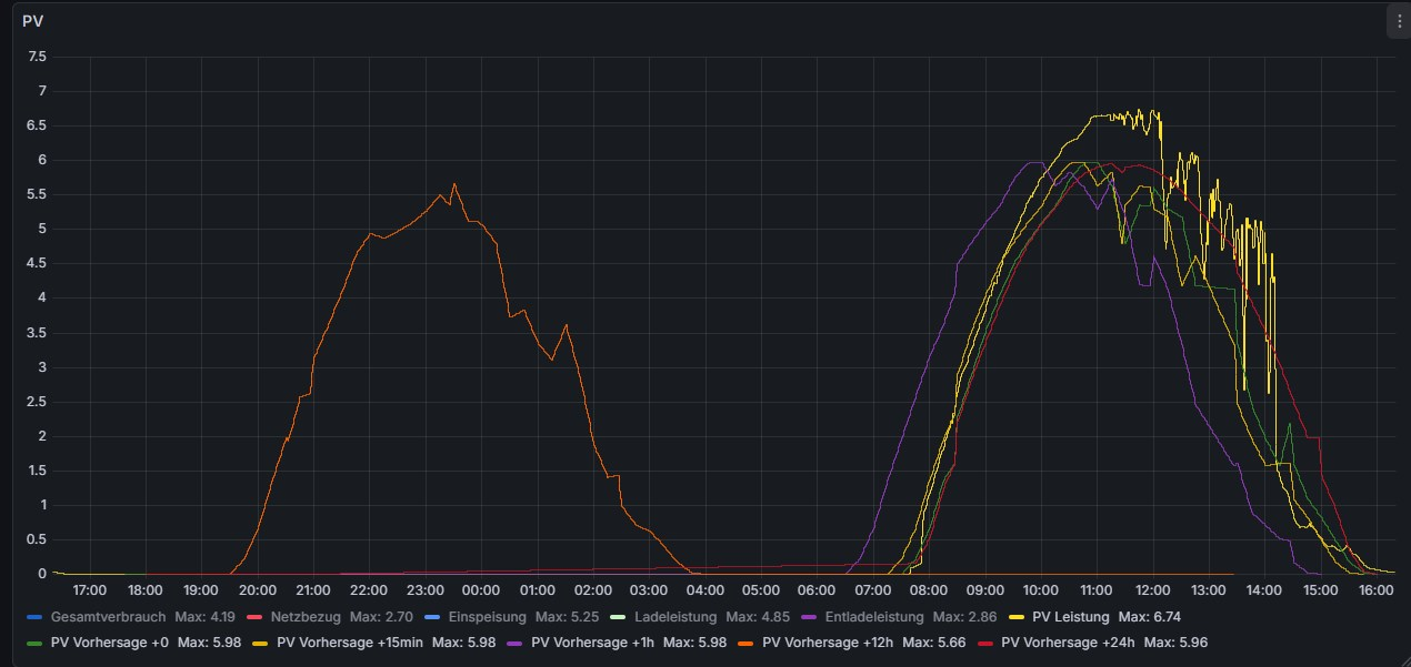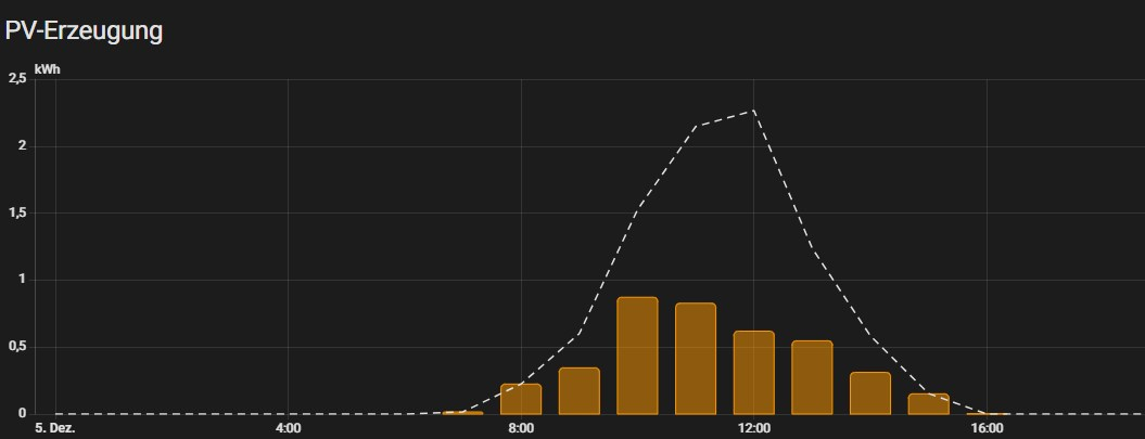 Danke für den Tipp, habs jetzt einmal in Homeassistant integriert. Vorhersage ist definitiv besser als Forecast.Solar, das war aber wirklich das gröbste Schätzeisen. Interessant finde ich, dass die Daten im Energy Dashboard rückwirkend angezeigt werden. K.A. - korrigiert er die Vorhersage bis zum quasi letzten Moment und lässt den Letztwert dann dort stehen?! An mittel bis guten Tagen scheints etwas zu unterschätzen An richtigen Mistwettertagen ist die Tendenz eher zum überschätzen, aber die Grundform der Kurve zeigt durchaus realistisch auf was man sich einstellen muss. An Top Tagen scheints zu stimmen Wie bekommt ihr die Werte in Grafana zum übereinanderlegen? Macht ihr euch da Helfer wo ihr die Vorhersagen reinschreibt? Gibt ja Vorhersage der PV Leistung von "Jetzt" über "in 15min" bis "in 24h" Man müsste die Kurven ja mit entsprechendem Zeitversatz darstellen, dann hätte man einen Vergleich "wie genau ist die 24h Vorhersage" zu "wie genau ist die 1h Vorhersage" - müsste ja mit jeder Stunde genauer werden. |