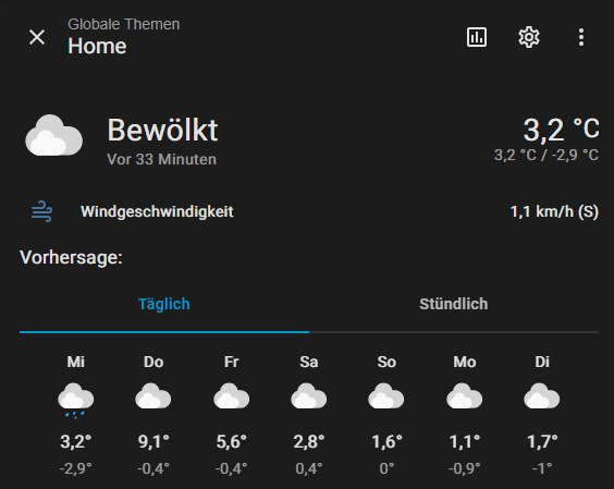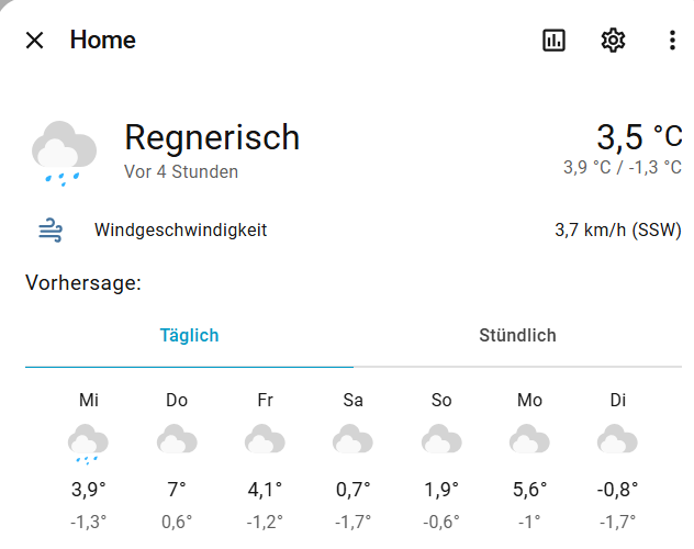 Ja genau, das ist ein Unterschied. Open-Meteo ist reine Wettervorhersage - und das offensichtlich keine besonders prickelnde. Das Ding kennt wohl nur Mistwetter 🤣 Die Standard Wettervorhersage von HA ist da etwas positiver gestimmt |