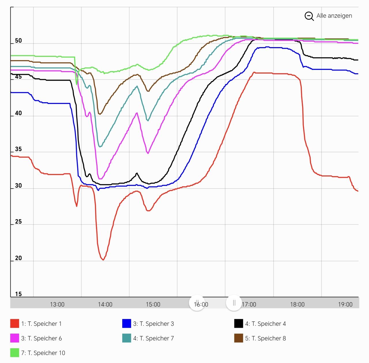 Ich glaub, ich hatte noch nie hier Messwerte vom TWL Speicher eingestellt. Ich habe den Speicher mit 10 Anlegesensoren ausgestattet von 1 für 10 % (unten) bis 10 für 90 % (oben). Leider waren die Sensoren nicht gut. Relativ schnell sind 30 % ausgefallen. Zum Glück nicht die Grenzen bis jetzt. Aber der Rest vom Fest sieht trotzdem gut aus. Wenn eine (alle) Linien runtergehen, wird Warmwasser konsumiert, oben geht warmes Wasser raus, unten kaltes rein, zunehmend kälterer Speicherinhalt rutscht hoch. Wenn hoch, wird nachgeladen, d.h. oben geht warmes Wasser rein, unten kaltes raus, zunehmend wärmerer Speicherinhalt rutscht runter. Die Linien sollen sich im Idealfall niemals kreuzen, abgesehen von Messungenauigkeiten bei kleinen Differenzen. Ich vermute in Realität tun sie das auch nicht, aber die Messung ist mit Anlegefühlern nicht schnell, d.h. bei schnellen Änderungen (Warmwasser wird konsumiert, viel Kaltes kommt unten rein und schiebt alles hoch, obere Sensoren sehen Kälteres) kann es passieren, dass die Wärmeänderung bei einem Sensor geringer ist als bei anderen und deswegen länger braucht bis messbar. Ansonsten sieht man eine klare Schichtung. |