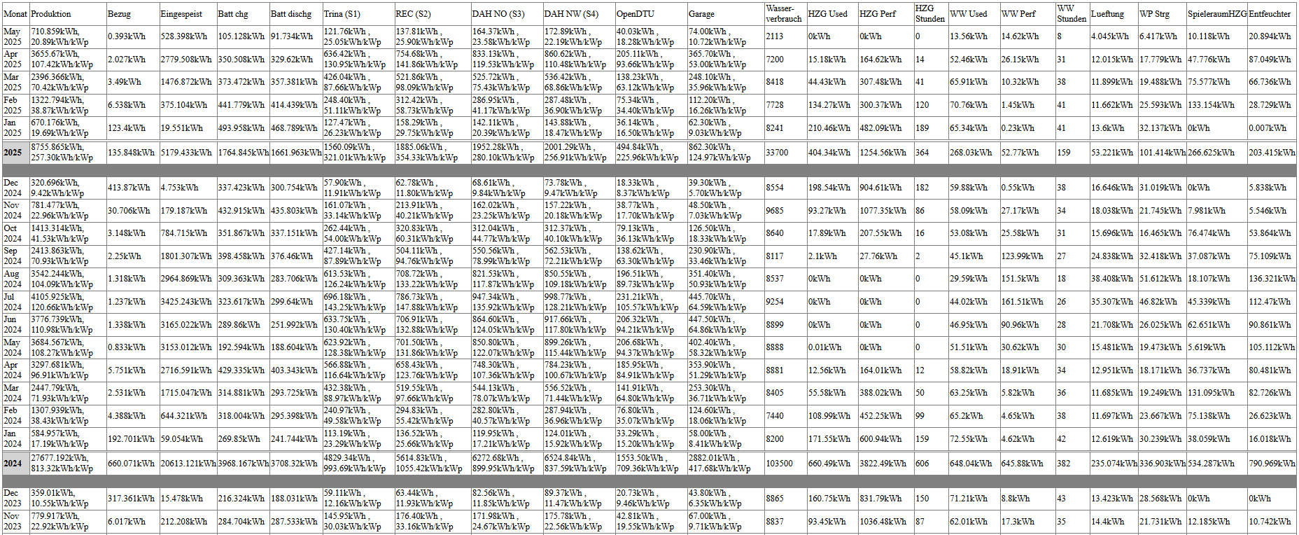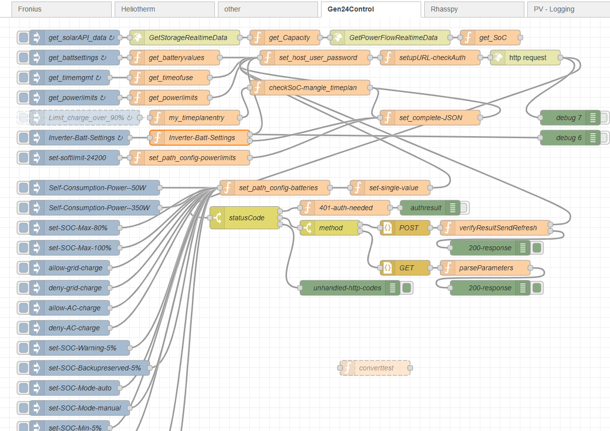 ich hab mittels node red gescripted und optimiert. gen24 mit 44kWh Speicher. optimierungen / automatisierungen: -) prognose wird teilweise mit einbezogen -) peak shaving mit automatisierten netzbezug von 700W, 900W oder 1900W (alle drei Fälle um unter 2kW also abgerundet 1kW Netzleistung zu bleiben -) Akku vormittags nicht laden, da ich mehr Leistung von den Generatoren habe als ich Einspeisen darf wird das dann automatscih in den Akku geparkt -) Mo - Sa maximal 80% Akkuladung - So 100% zum balancen -) seit heute: Abends gezieltes Einspeisen aus dem Akku in die EEG, wo ich sehe dass mehrverbrauch da ist und folglich ich erwarte dass ich mehr von meinem Strom an die EEG verkaufen kann (siehe https://www.energiesparhaus.at/forum-neoom-energiegemeinschaft-wer-ist-schon-dabei/75958_22#880561) -) abhängig von Nachtzeit und AkkuSoC Statt Nullausregelung 50, 150, oder 350W konstant einspeisen damit der Netzbezug möglichst klein bleibt -) Wärmepumpe Warmwasserbereitung erst ermöglichen wenn genug PV und ein gewisser Akku SoC vorhanden -) falls zu kalt im Keller und PV-Überschuss vorhanden die E-Flächenheizung schalten -) sobald genug Überschuss den Entfeuchter im Keller starten leider ist das bei mir gewachsen (oder am wachsen) und folglich im Code alles Spaghetticode ... dank Node Red bleibt es "übersichtlich" - also so gut das halt geht und wenn man weiß welche Nodes man angreifen muss. Alles was mir irgendwie einfällt in einer db Speichern dass man sich Auswertungen machen kann - das sieht dann zB so aus: BEVBEV [Battery Electric Vehicle, Elektroauto] fehlt in der Tabelle noch, haben wir erst seit November. Da tut evcc + fronius Wattpilot bisher das was es soll |
