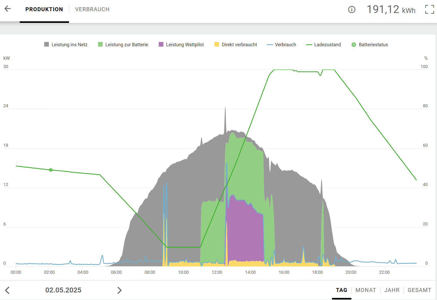 Ich hoffe meine Frau steigt auch bald auf ein eAuto um dann werde ich das auch so machen können, hohe Flexibilität mit dem riesigen eAuto Speicher ist ein richtiger "Gamechanger". Ist aus meiner Sicht auch nur eine Spielerei, wenn man das nachrechnet (Speicherverluste; Einspeisung in kWh; Differenz zu EEG Vergütung) bleibt nicht wirkich etwas über, aber der Speicher wird zumindest genützt (den Zyklentod wird er eh nicht sterben). welche Hard/Software? Hab ich auch überlegt, aber der Netzbezug ist so auch gering, Netzbezug verursacht bei mir eher das eAuto, weil ich es nicht intelligent auf PV Überschuss regle, sondern fix auf 6 kW (das kommt dann entweder aus dem Speicher oder von Dach, mehr geht eh nicht, weniger praktisch auch nicht. |