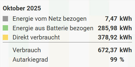 Obwohl heute ein 100% Tag betreff Autarkie war, ist der Oktober aufgrund der Ausregelungsgeschwindigkeit  des Wechselrichters nicht mehr auf 100% emoji