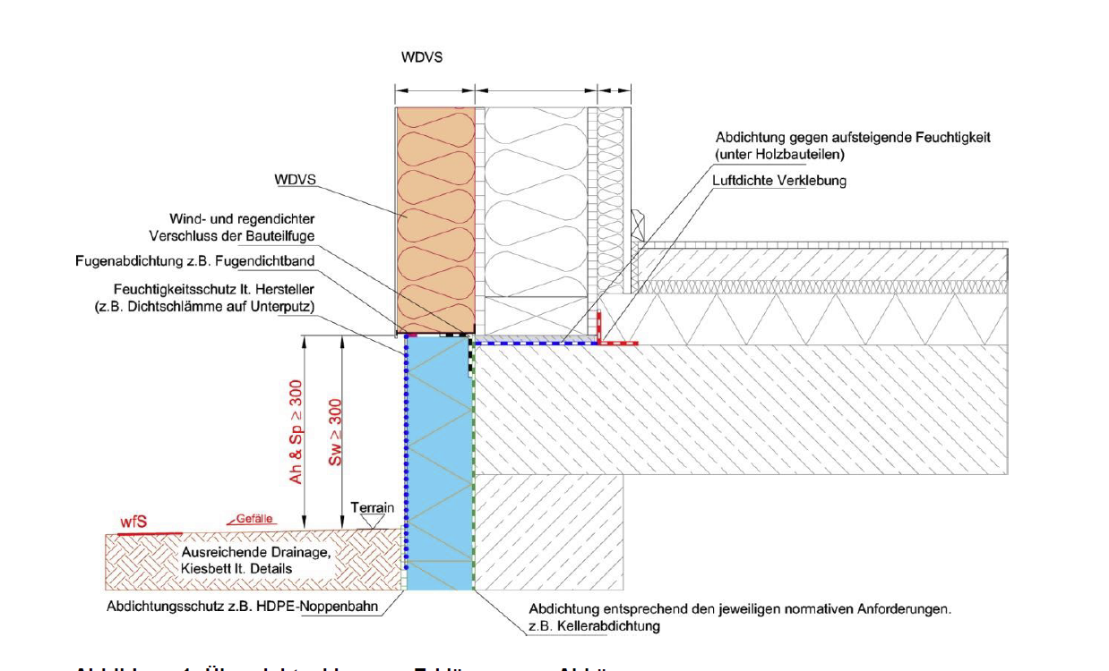 2. Fehlendes Fugenband zwischen Holzhaus und XPS-Dämmplatte Zwischen dem Holzhaus und der XPS-Platte wurde kein Fugenband eingebaut. Dadurch kann kalte Luft hinter die Dämmung gelangen und den Sockel auskühlen.
