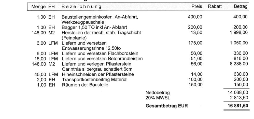 Es war ein Selbstständiger und ich habe ihn unterstützt 7,5 Tage lang. Wir hatten andere Angebote zwischen 19.000€ und 25.500€ da hätte ich nicht helfen müssen. Aber unser Pflasterer war von der Qualität her - Ausgezeichnet. Eisenstadt Umgebung |