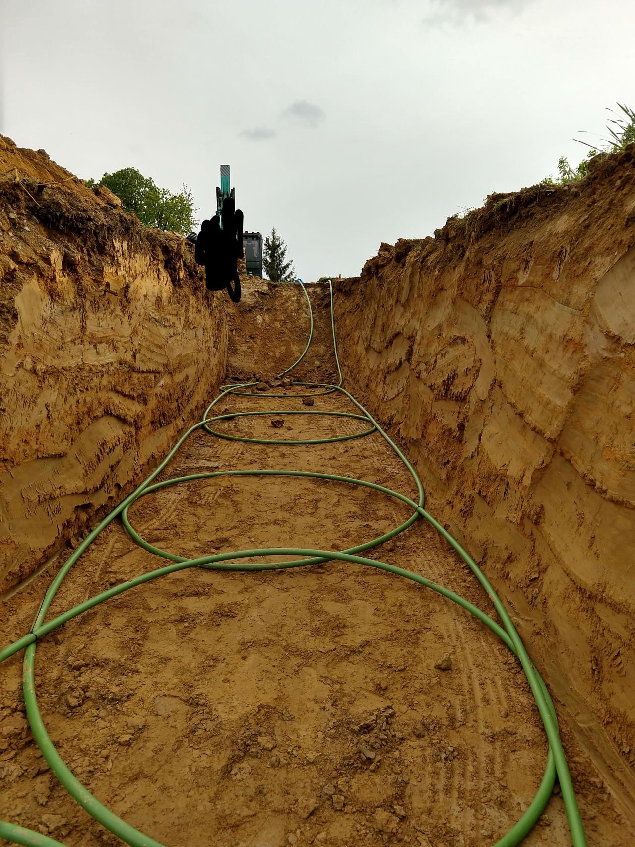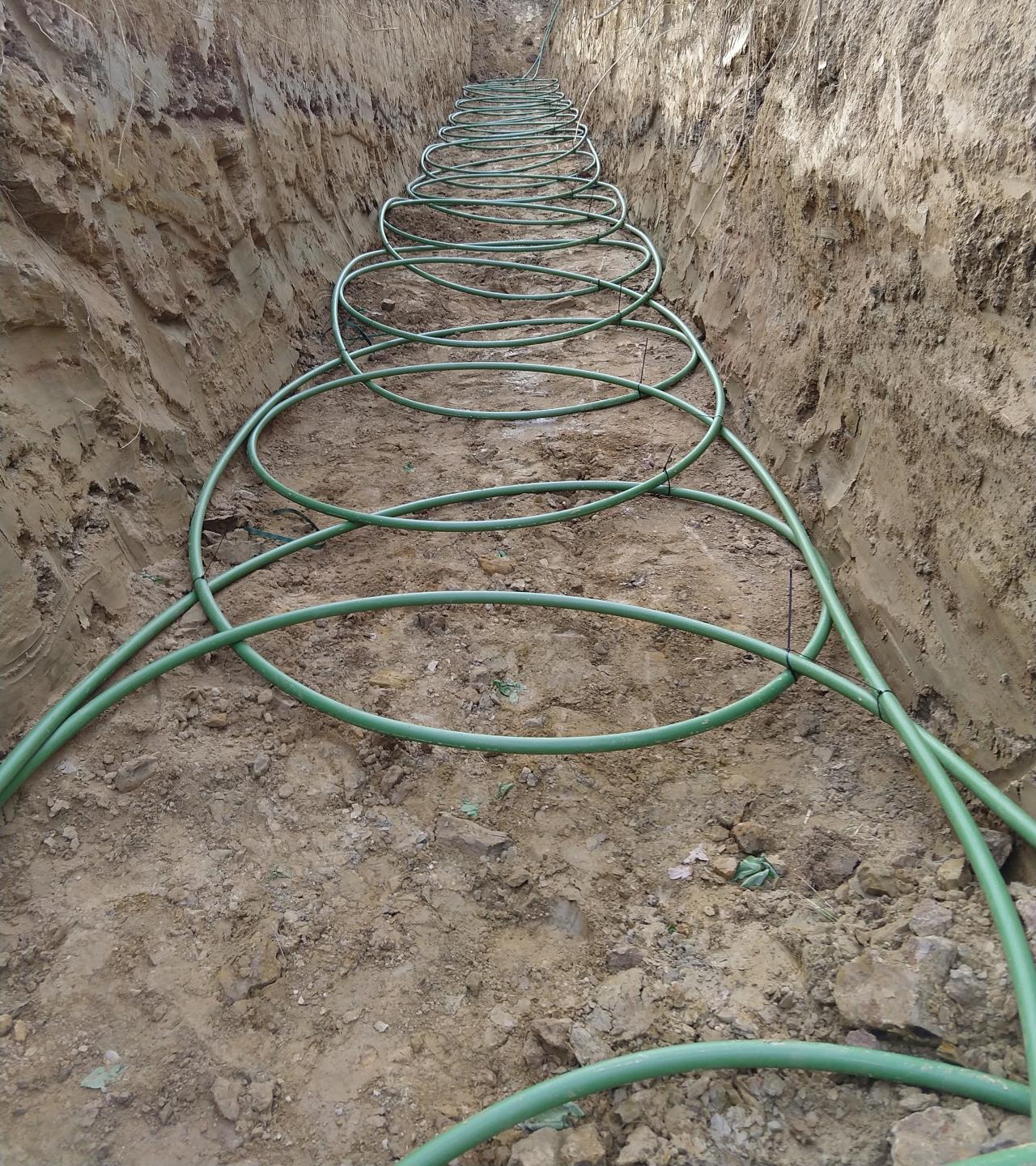 Beim vertikalen würde ich die Schleifleitungen unten legen und die Schleifen beim Verfüllen an die Grabenwände drücken, damit die zwei Kreise möglichst viel Abstand voneinander haben.