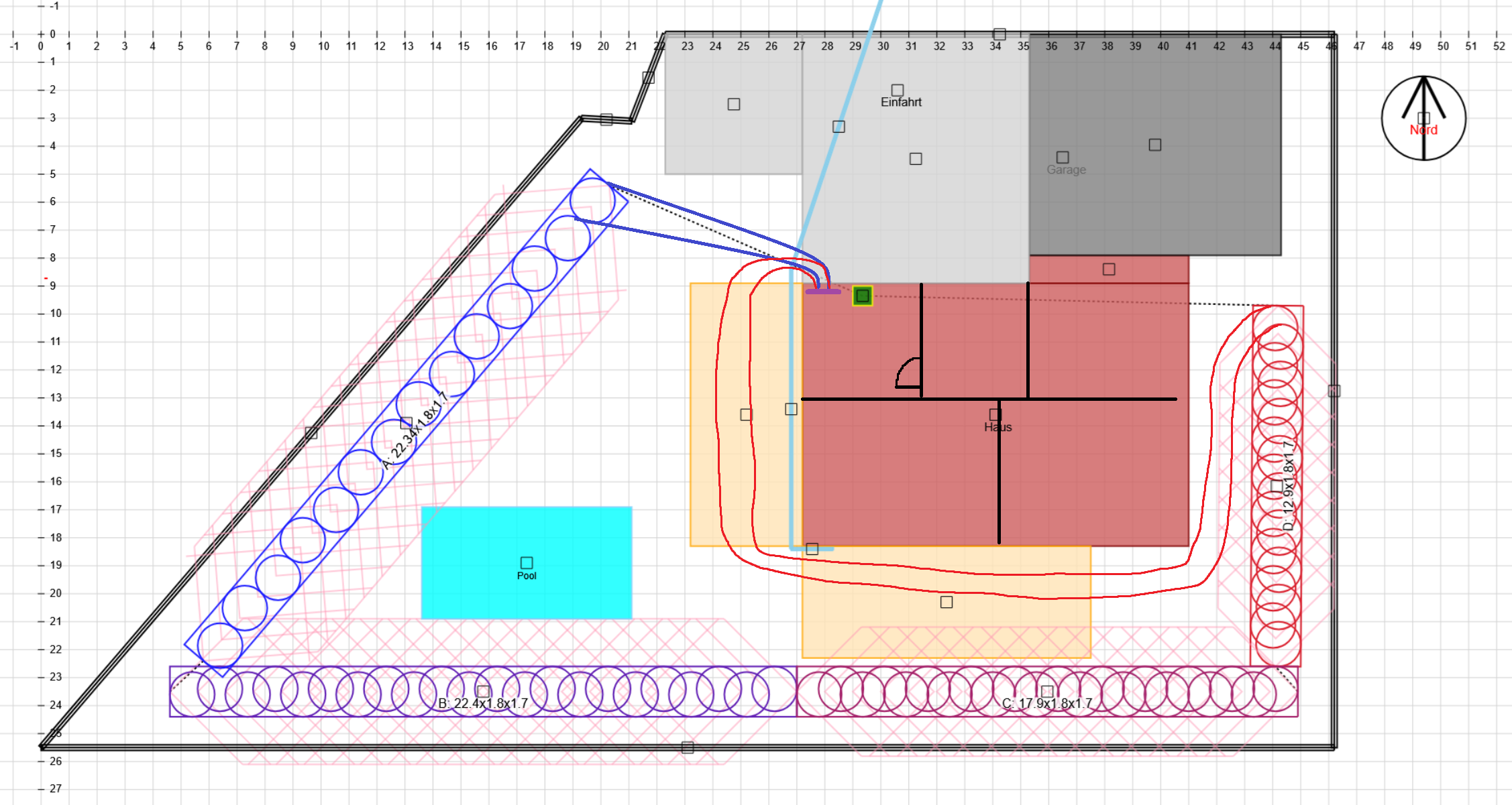 Auf Basis der aktuellen Planung hab ich die Rohre mal umgeplant und ebenfalls wieder 1m vom der Grunstücksgrenze platziert.