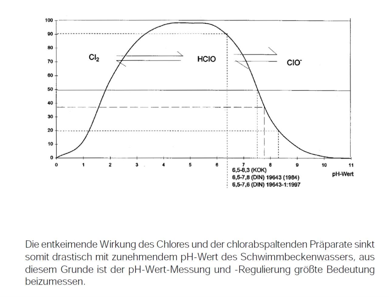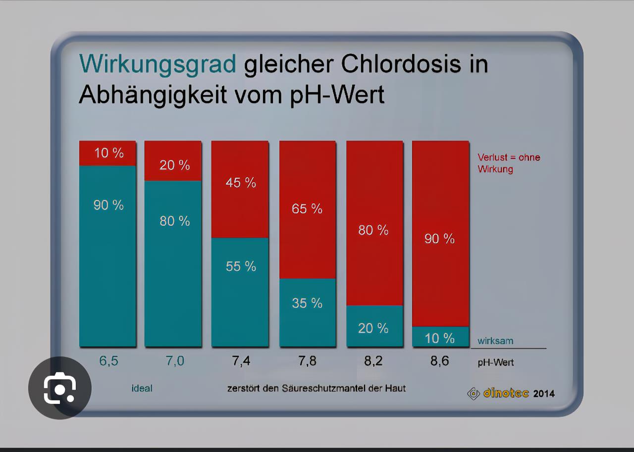 So ist es, die Wirksamkeit des Chlors variiert extrem nach PH-Wert, so finde ich die oft empfohlenen 7.4 als zu hoch, 7.2 ist eher anzustreben.