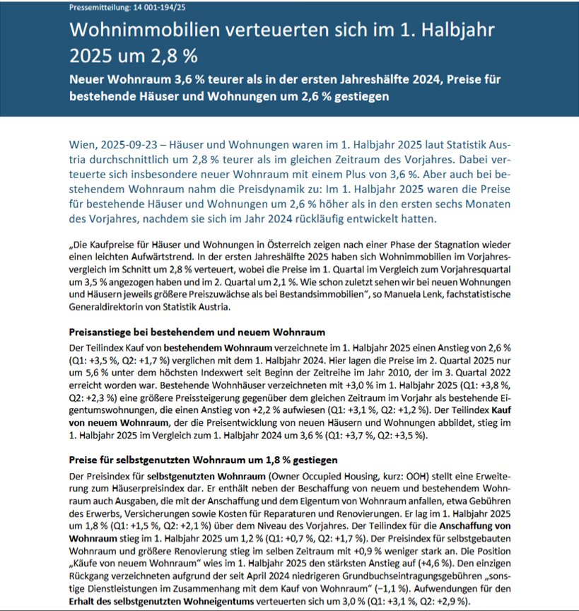 Der positive Trend bei der heimischen Wohnimmobilienpreisentwicklung bestätigt sich lt. Statistik Austria auch im 1. HJ 2025. Details unter: https://www.statistik.at/statistiken/volkswirtschaft-und-oeffentliche-finanzen/preise-und-preisindizes/haeuserpreisindex-und-ooh-pi |