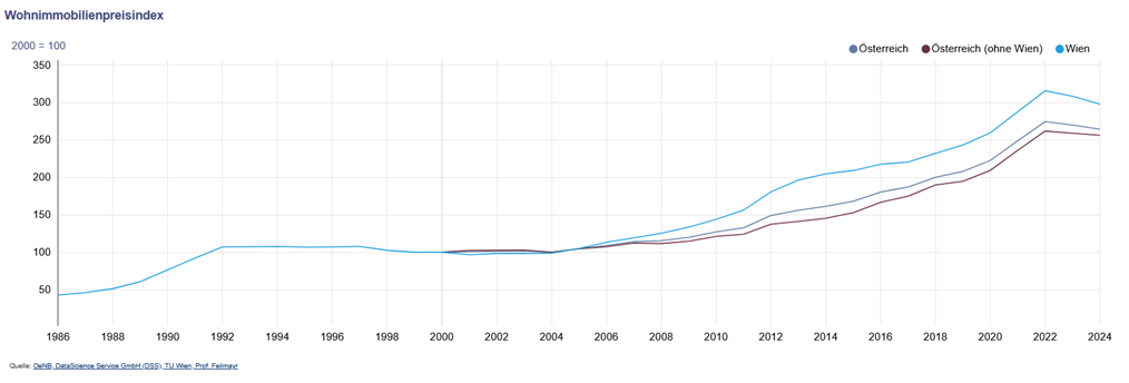 wenn 15 Jahre zu knapp sind - anbei der Wohnimmobilienpreisindex seit 1986 (jährliche Werte) ... ... mit (klarerweise) gleichem Peak 2022 ... deswegen habe ich geschrieben btw: sind alles nicht "meine" Charts - alles in offiziellen und zugängigen Quellen nachzurecherchieren (in dem Fall konkret bei Österreichische Nationalbank https://www.oenb.at/isawebstat/createChart?&lang=DE&&report=6.6) bzw. der Chart des Häuserpreisindex ist wie oben angedruckt von Statistik Austria