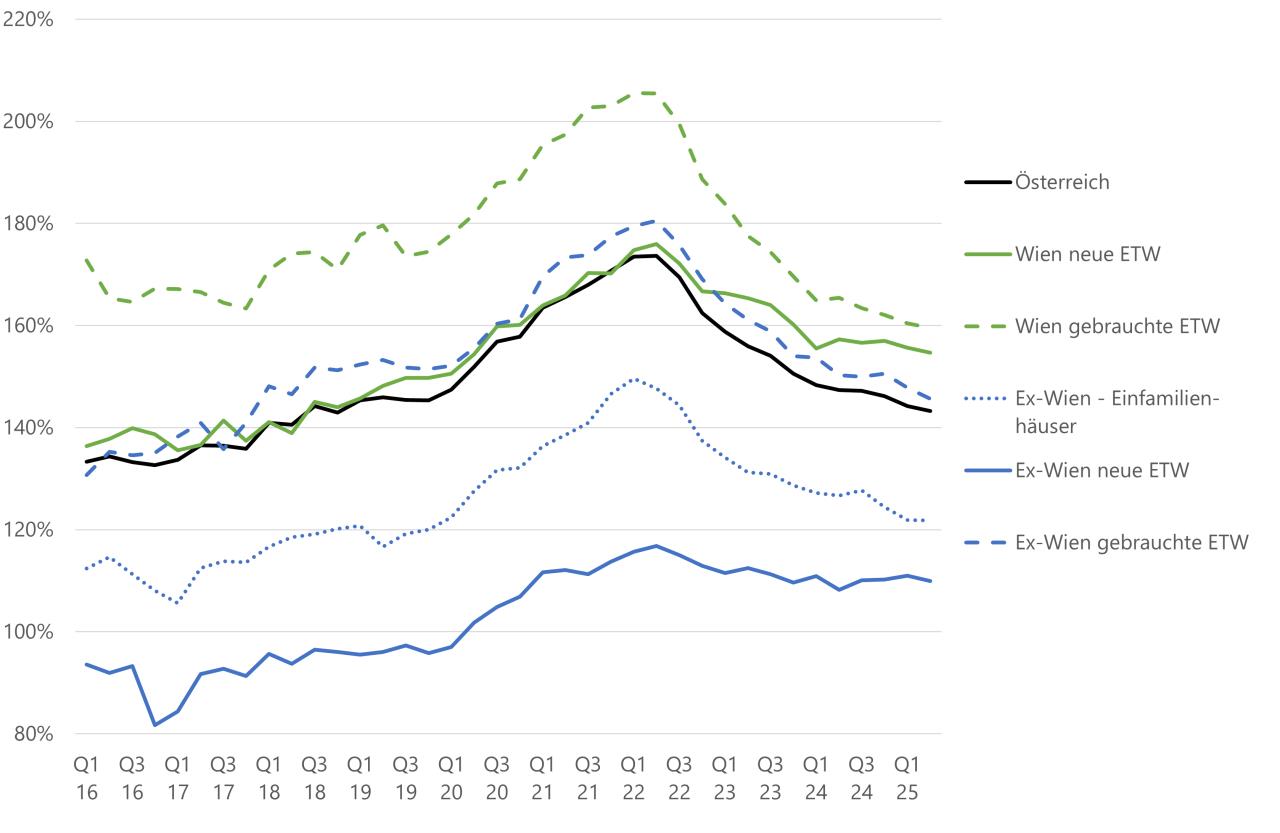 Ich habe das vor 2 Jahren (mit den damaligen Zahlen) schon gepostet und heute schnell aktualisiert, das sind die realen Immopreise, d.h. ÖNB Immobilienpreisindex (Basisjahr 2000 mit 100) zu VPI 2000 (eben selber Basisjahr und auch Ausgangswert 100). Also die letzten 10 Jahre dargestellt, aber das Basisjahr liegt bereis 25 Jahre zurück. Den realen Rückgang der letzten Jahre sieht man da mittlerweile sehr schön (und auch dass das in erster Linie nur gebrauchte Immobilien betrifft) und auch die Unterschiede je nach Segment (und eben auch die Sonderrolle von Wien) in der langen Frist. Würde man Ex-Wien weiter ausdifferenzieren wären die Unterschiede noch deutlicher, da fehlen mir aber die Zahlen PS: Zum einfacheren Verständnis, der VPI 2000 liegt aktuell etwa bei 185, die darstellten Immoblienindizes zwischen 203 (->110%) und 304 (->165%)