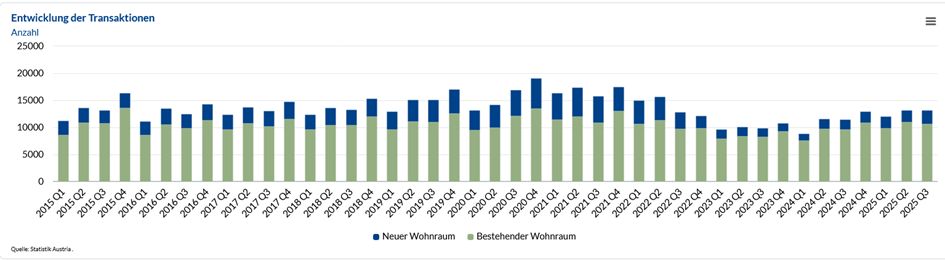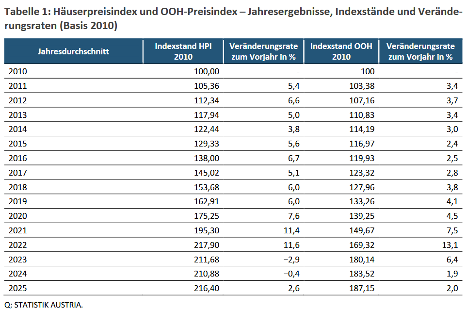 finale Daten zur Entwicklung der Wohnimmobilienpreise 2025: „Im Jahr 2025 wurden in Österreich um 18,3 % mehr Wohnimmobilien gekauft als 2024. Das ist der stärkste Anstieg bei Immobilientransaktionen seit mehr als einem Jahrzehnt. Gleichzeitig hat sich der Kauf von Wohnungen und Häusern mit einem Plus von 2,6 % nach 2 Jahren erstmals wieder verteuert. Dabei war neuer Wohnraum im Schnitt um 2,9 % teurer als 2024, bei bestehendem Wohnraum fiel der Preisanstieg mit +2,5 % etwas niedriger aus." Details unter: https://www.statistik.at/fileadmin/announcement/2026/03/20260326HaeuserpreisindexQ42025.pdf |