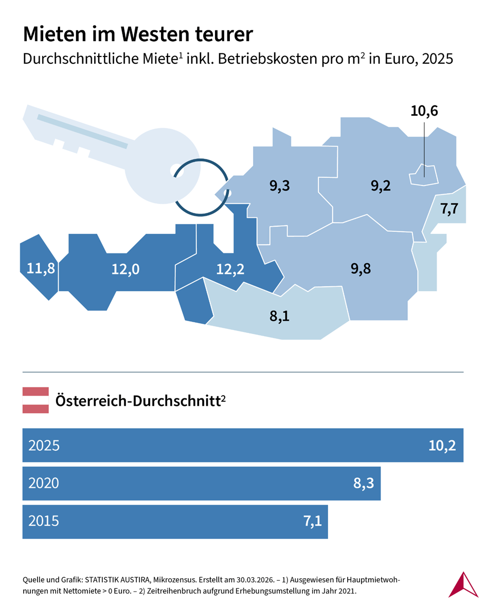 to be continued ... "Im 4. Quartal 2025 lag die durchschnittliche Miete inklusive Betriebskosten laut Statistik Austria bei 10,4 Euro pro Quadratmeter. Im Vergleich zum Vorquartal ist das ein Anstieg um 1,6 %. Damit blieb das Mietniveau in allen Quartalen des Jahres 2025 durchgehend im zweistelligen Euro-Bereich." https://www.statistik.at/fileadmin/announcement/2026/03/20260313Wohnen2025Q4.pdf bzw. https://www.diepresse.com/20663067/es-wird-enger-am-wiener-wohnungsmarkt bzw. https://www.sn.at/wirtschaft/oesterreich/boomjahre-fuer-immobilien-sind-vorerst-vorbei-art-640848?xing_share=news |