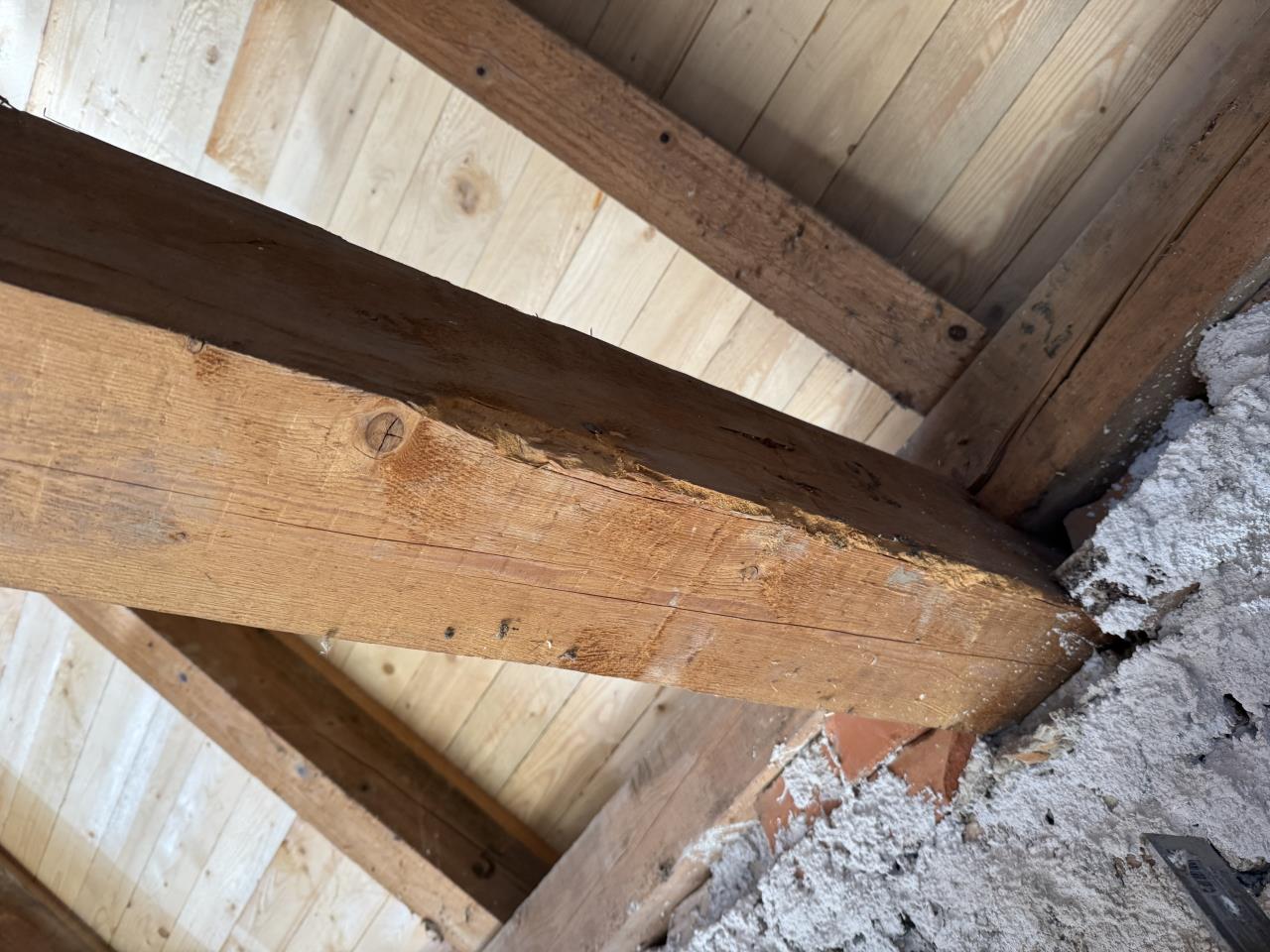 Für mich sieht das nach Holzwurm aus. Wir hatten einige solche Trame im Haus. Die Zimmerer waren aber ziemlich entspannt dabei. Zum Prüfen haben sie mit einem spitzen Messer hinein gestochen, um zu schauen wie tief das Holz weich ist. Das war bei uns nur ca zwei cm. Zur Lösung hätten sie die schadhafte Stelle abgebeilt und mit "Holzwurmtod" gestrichen. Falls zuviel Holz weggegangen wäre, wäre der Balken aufgedoppelt worden. Ich schreibe im Konjunktiv, weil wir schlussendlich den Dachstuhl doch erneuert haben... Daher bleibt es bei Theorie. |