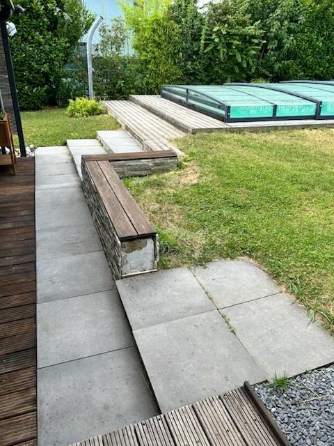 - Bei den vier Fliesen, die als einzelne Stufe zum Garten hin gelegt wurden bin ich unschlüssig. Sollen die auch einfach im Splittbett verlegt werden, da der Aufwand für das Betonieren doch sehr hoch ist..
