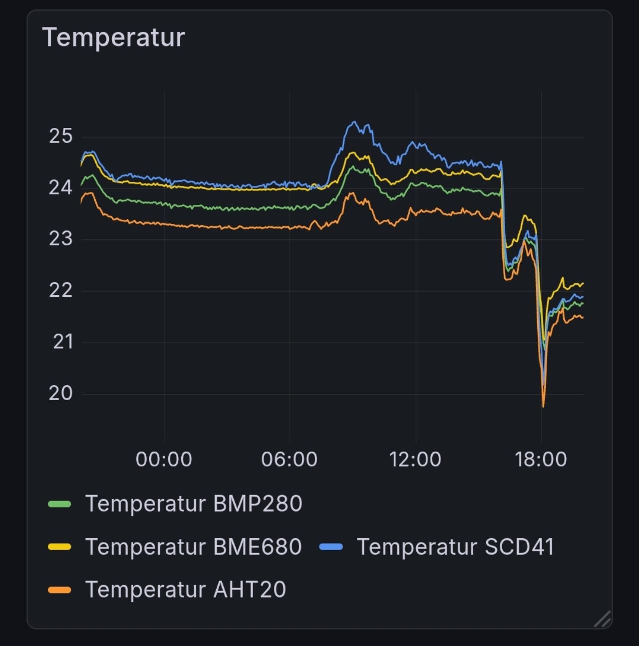 Lüfter ist ein No-Go, selbst wenn der extrem klein und leise ist will ich keine Schallquellen verbauen. Das gute vom Rahmen wäre ja, dass der quasi luftdicht zur Unterputzdose ist. Die Sensoren schnüffeln damit eigentlich nur Außenluft. Nachdem ich ein paar Sensoren am laufen hab werd ich die wohl erstmal alle nebeneinander in Betrieb nehmen und kalibrieren, da wärs dann auch kein allzugroßes Thema temporär einen zusätzlichen Sensor einmal 1-2 Tage neben dem fix eingebauten zu parken und dann in Homeassistant bzw. direkt am ESP den Wert noch zu korrigieren. Ich erwarte mir da eine relativ konstante Abwärme, damit sollte das beherrschbar sein. Der SCD4x Sensor hat da sogar intern eine Variable zur Temperaturkorrektur weil er selbst eine Heizung verbaut hat. Ist ein Grund warum ich da neben einem Drucksensor auch einen externen Temperatursensor nutzen will. Für den Einbau unten gäbs auch vom BMP/BME280 kleinere Platinen die unten reinpassen - BME hätte Druch, Temperatur und Feuchte an Bord, ist aber mit ca. 6€ relativ teuer, der BMP hätte nur Druck und Temperatur, Feuchte kann der SCD4x selbst ganz gut. https://www.az-delivery.de/products/gy-bme280?variant=19385550569568 Die Temperatursensoren die ich grad am laufen hab: Und Restliche Werte. Der AHT20 ist bei der Temperatur recht gut, Luftfeuchtigkeit ist (dieser) deutlich daneben, allerdings offensichtlich ein parallel Offset der sich leicht korrigieren lässt. |