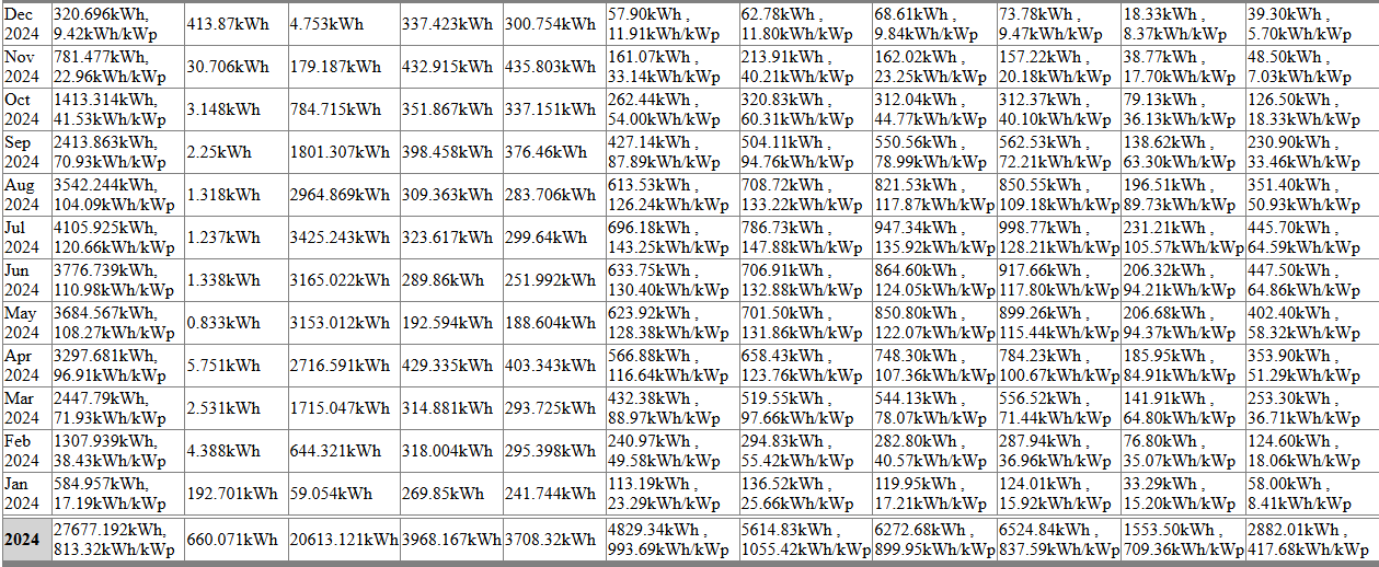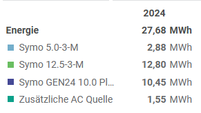 Fläche Nord DN10°: 77,58m² | PV: 65,27m² (13,53kWp, 33x DAH DHM-54X10-FS 410Wp) Fläche Süd DN10°: 48,76m² | PV: 37,86m² (5,32kWp, 19x REC 280TP 280Wp + 1,23kWp, 3x DHM-54X10 410Wp) Gaube Ost/West DN15°: 28,82m² | PV: 22,51m² (4,86kWp, 12x Trina Vertex S DE09.08 405Wp) Fronius Gen24 10.0 für Süd und Ost/West | S1 2x 6x Trina 405Wp | S2 1x 19 REC 280Wp Fronius Symo 12.5-3-M für Nord | S1 17x DAH 410Wp | S2 19x DAH 410Wp Die Module am Nord-Symo haben von zwei Kaminen Verschattung. Die Module im Süden und Ost/West sind unverschattet. Symo 5.0-3-M hat eine stark verschattete Westfläche mit 15 Stück 460W Modulen Zusätzliche AC-Quelle ist ein Hoymiles HMT-2250 mit 2x280W, 2x410W und 2x405W Modulen auf Nord 10° - auch stark verschattet. Klar, es sind bei mir im Norden 10° (vielleicht sind's sogar 12°, weiß ich nicht genau). Aber auch dann liefern die Module noch über 80% ihrer Nennleistung. aufgerechnet auf die Modulleistung (vergleiche jeweils kWh/kWp): <img src=" |