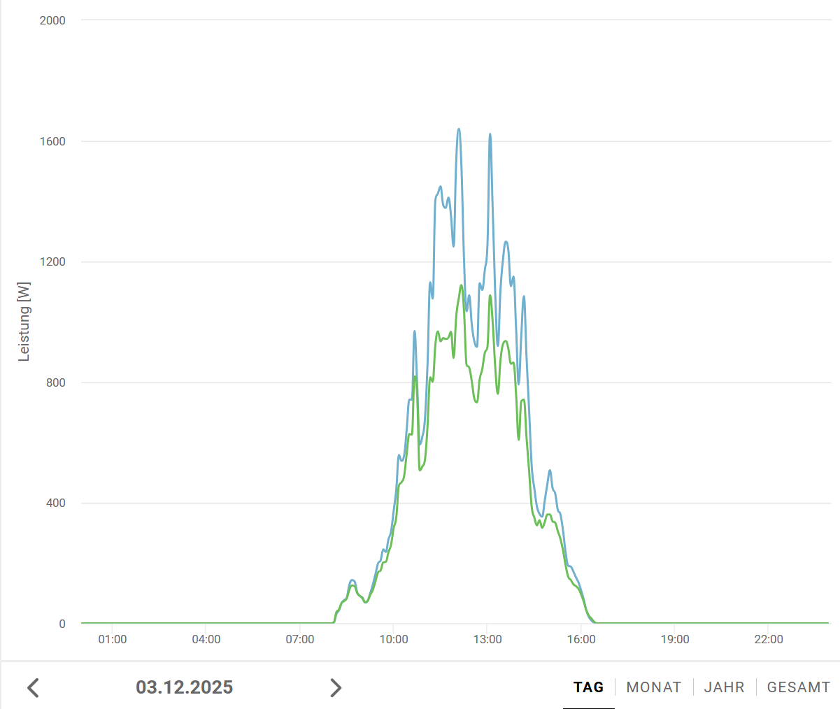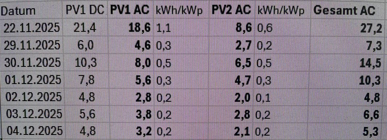 Ich persönlich sehe Nord so: Wenn gewisse Voraussetzungen gegeben sind, dann kann ein Norddach interessant sein. Also flachere Dachneigung, passendes Einspeiselimit und günstigere Kosten. Bzgl. Kosten können Theorie und Praxis unterschiedlich aussehen. Wenn man viel selbst macht, passt es, weil das Material ja günstig ist aktuell. Ansonsten kann es oft schwierig sein einen Solarteur zu finden, der da mitgeht und eine zusätzliche Nordbelegung entsprechend günstiger macht. Ich habe damals keinen solchen gefunden, es aber trotzdem gemacht, weil der kwp kwp [kWpeak, Spitzenleistung]-Preis für damalige Verhältnisse generell gut war und ich es einfach so wollte. Man muss aber schon bedenken, dass die übers ganze Jahr noch brauchbaren Erträge von Nord hauptsächlich im Sommer entstehen. Vor allem wenn auch noch ein Einspeiselimit vorhanden ist, schon zu bedenken. Bei mir bringt Nord im Winter einen Bruchteil verglichen mit den anderen guten Seiten: Bei meiner 18 Grad DN sind es im Dezember 1/3 vs Süd bzw. 1/2 vs Ost oder West. Bei wenig oder diffusem Licht bringen alle Seiten ähnlich viel bzw. muss man eher sagen ähnlich wenig. Da kann man nie genug haben, aber insgesamt ist dann die Ausbeute generell gering. Ich habe insgesamt 30kWp mit 4 Ausrichtungen in einer durchschnittlich guten PV-Gegend. An schlechten Tagen kommen trotzdem manchmal gerade mal 4kWh runter. Wenn ich da meine schlechteren Seiten nicht hätte, dann hätte ich halt 2kWh. Das ist dann auch schon fast egal. Wenn es dann schöner wird, rennen die guten Seiten davon. Ich bin nicht gegen Nord, habe ich ja selbst. Aber ich würde halt etwas differenziert betrachten. Hier ein Beispiel der letzten Tage. Allerdings nicht nur Norden (kann ich nicht separat monitoren). PV1 ist 16kWp OSO+SSW und PV2 ist 14kWp NNO+WNW. |