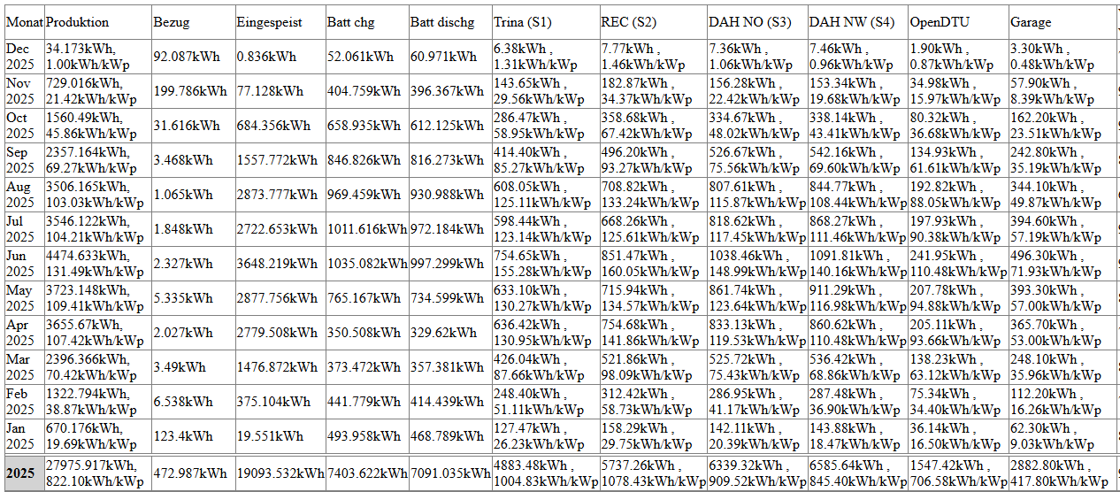 Fläche Nord DN10°: 77,58m² | PV: 65,27m² (13,53kWp, 33x DAH DHM-54X10-FS 410Wp) Fläche Süd DN10°: 48,76m² | PV: 37,86m² (5,32kWp, 19x REC 280TP 280Wp + 1,23kWp, 3x DHM-54X10 410Wp) Gaube Ost/West DN15°: 28,82m² | PV: 22,51m² (4,86kWp, 12x Trina Vertex S DE09.08 405Wp) Fronius Gen24 10.0 für Süd und Ost/West | S1 2x 6x Trina 405Wp | S2 1x 19 REC 280Wp Fronius Symo 12.5-3-M für Nord | S1 17x DAH 410Wp | S2 19x DAH 410Wp Die Module am Nord-Symo haben von zwei Kaminen Verschattung. Die Module im Süden und Ost/West sind unverschattet. Symo 5.0-3-M hat eine stark verschattete Westfläche mit 15 Stück 460W Modulen Zusätzliche AC-Quelle ist ein Hoymiles HMT-2250 mit 2x280W, 2x410W und 2x405W Modulen auf Nord 10° - auch stark verschattet. Klar, es sind bei mir im Norden 10° (vielleicht sind's sogar 12°, weiß ich nicht genau). Aber auch dann liefern die Module noch über 80% ihrer Nennleistung. aufgerechnet auf die Modulleistung (vergleiche jeweils kWh/kWp): --> Im Jahresschnitt sieht man dass der Norden 85% im Vergleich zu der (auch recht flachen) Südseite bringt. |