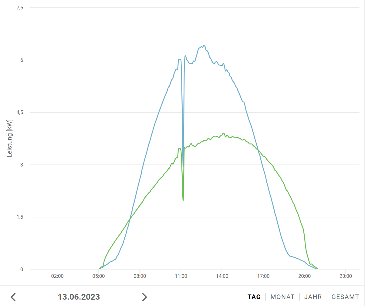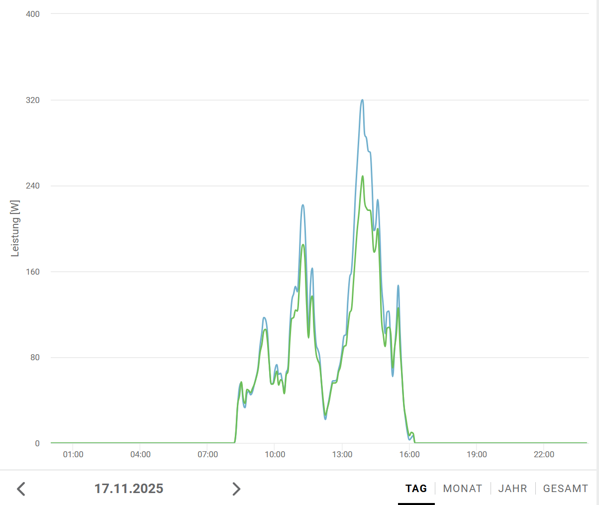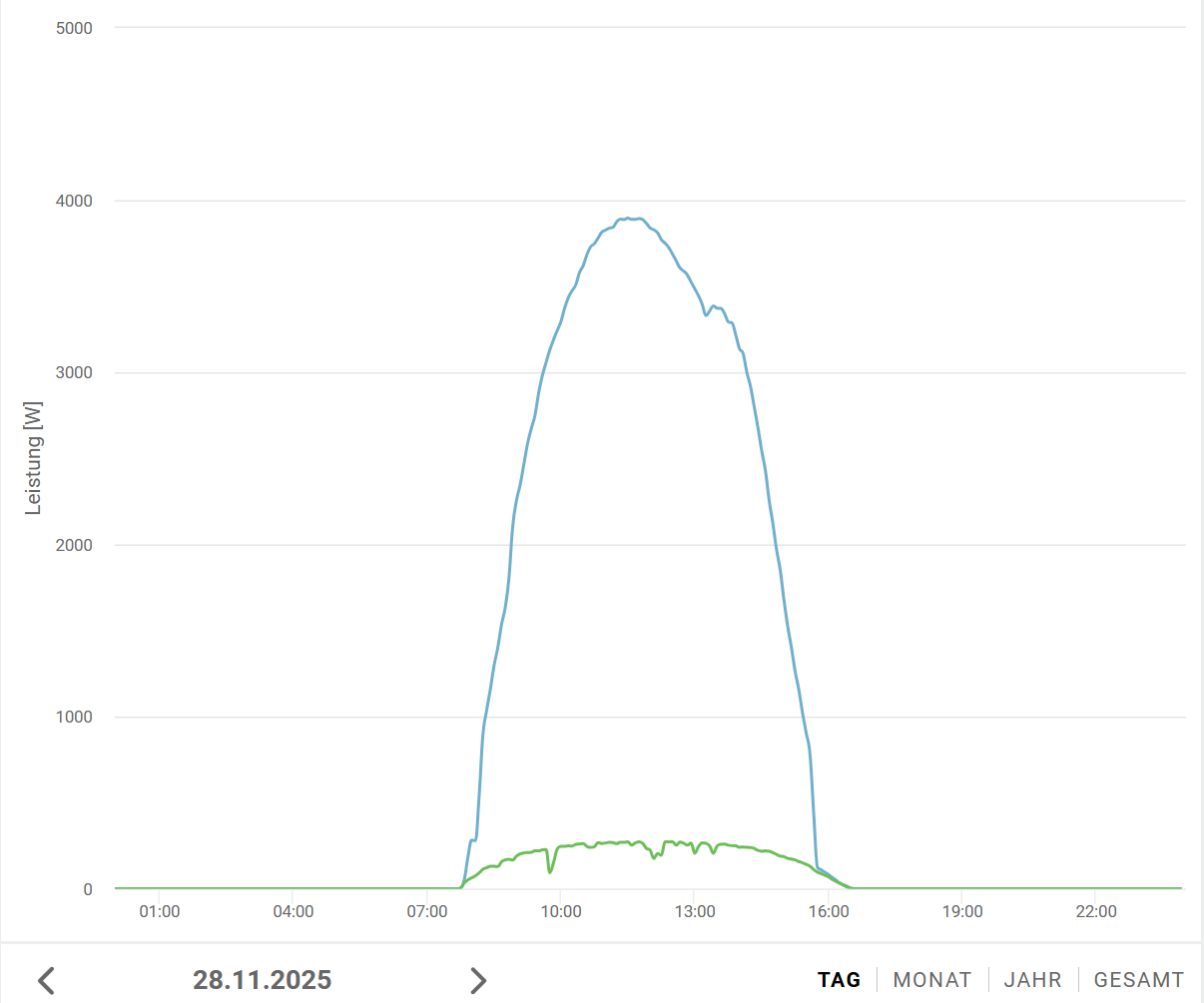 Ja, es sind 6,56 kWp kWp [kWpeak, Spitzenleistung] auf dem Norddach. Naja es rentiert sich weil nicht das ganze Jahr lang Winter ist. Aber wie gesagt, auch im Winter bringen sie zumindest bei Nebel gleich viel wie die Süd Panele. Und wenn ich da tagsüber keinen Strombezug haben will brauch ich die Fläche. Das mit den max 300W peak ist ja auch nicht richtig. An dem Tag war es kalt und die Nordseite gefroren. Weil keine direkte Sonne sind sie nicht aufgetaut. Ist mir aber an so einem Tag egal, weil die Südseite liefert. Hier zb gestern. War auch komplett nebelig, aber nicht gefroren: Da sind wir bei über 1kW. Und da reicht die Nordseite um zB. die Wärmepumpe ca. 6h lang zu versorgen. Und an einem Sommertag schauts zB. so aus: Da decke ich mit der Nordseite die Morgenspitze im Verbrauch ab, weil da die Südseite noch weniger liefert. Und vorallem die Abendspitze, weil die Südseite nicht mehr liefert. Laut PV-Gis bekomme ich rein von der Nordseite über 4.300 kWh im Jahr runter. Aufgrund der geringeren Spitzenleistung vermute ich mal dass da der durchschnittliche Eigenverbrauch höher ist. Aber selbst wenn der da bei nur 1500 kWh liegt sind das bei 25c die ich nicht für den Bezug zahlen muss auch € 375 im Jahr. Das heißt die reinen Modulkosten sind alleine in 7,5 Jahren herinnen. Ja, natürlich die Montage und Unterkonstruktion. WR bräuchte ich ja eh für die Südseite auch, die Leute waren "sowieso" vor Ort. Einspeisung hab ich da noch gar nicht gerechnet. Also ich würd sagen es rentiert sich schon. Aber es soll eh jeder machen wie er will. Ich für mich bin heilfroh dass ich die Nordseite mitbelegt habe. |