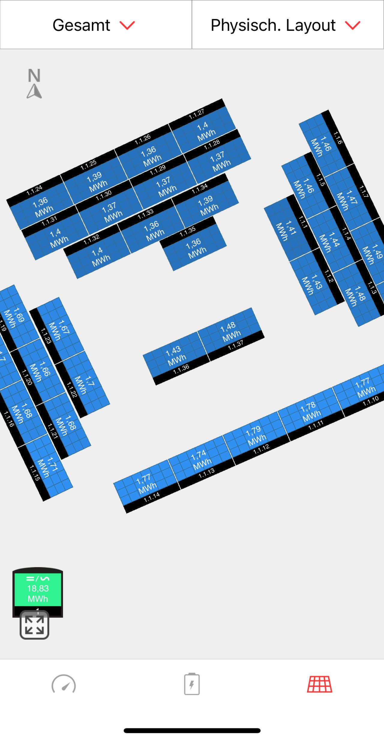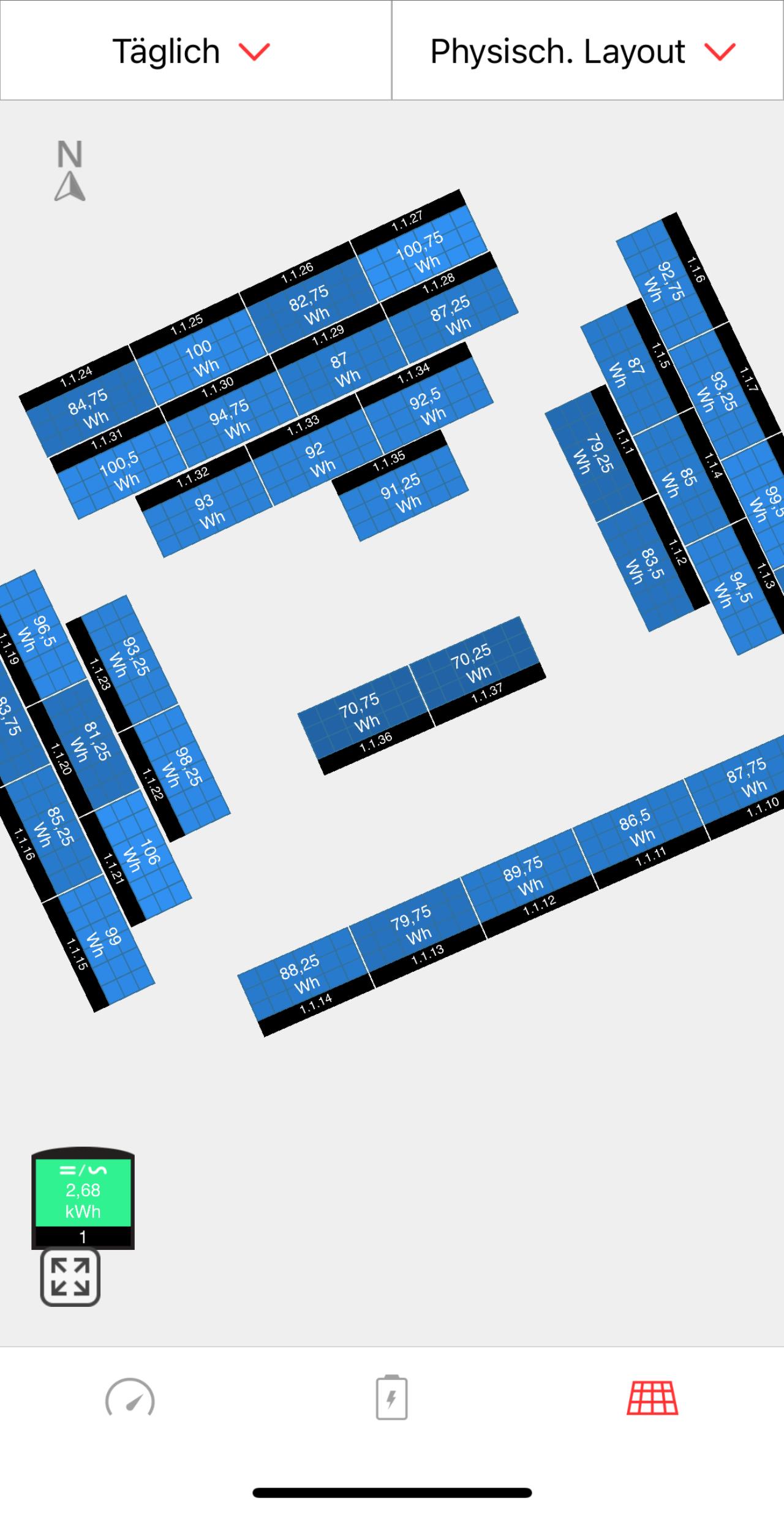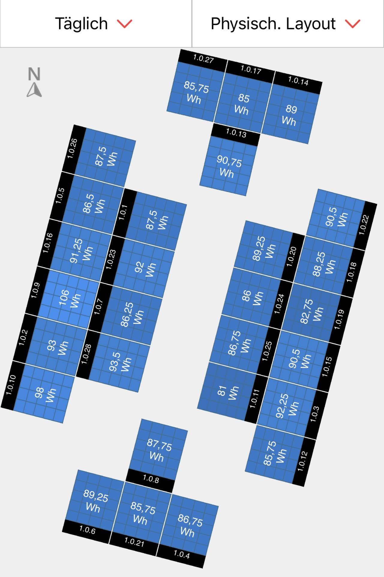 Mein Pultdach hat 7 grad. Im Zuge meiner Erweiterung letztes Jahr von 9kWp auf 26kWp hab ich das Norddach mitbelegen lassen. Wenn schon, denn schon. Wenns grau in grau is, hilfts aber wie schon oben geschrieben, trotzdem nix. Gestern 4,4kWh erzeugt mit 26kWp 🥳🥳 |