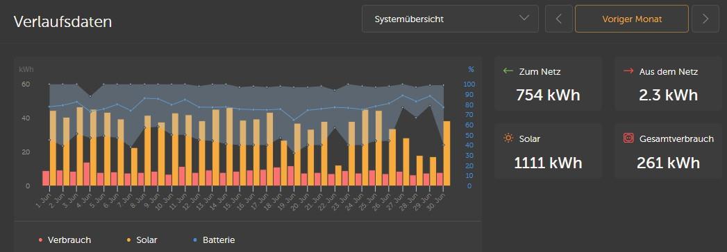 neuer versuch: (nutze librecalc und das war schon n akt die punkte in kommas zu wandeln, um ne summe zu bilden. hab davon echt zu wenig ahnung) also das VRM rechnet batt 2 grid in die gesamteinspeisung. wenn man das weiß, kein problem. aber was ist PV to consumers? hier juni im VRM: laut EVU-zähler habe ich im juni 737 kWh eingespeist und 1 kWh verbraucht. hier VRM zu knapp den uhrzeiten , wo ich den zähler abgelesen habe: demnach wurden 1081 kWh erzeugt. minus einspeisung 737 kWh plus bezug 1 kWh gleich 345 kWh verbraucht. VRM gibt einen gesamtverbrauch von 257 kWh an. 345 - 257 = 88 kWh verlust ? ob der verlust vom dach zum ausgang RS450 da schon drin ist, ist mir grad nicht klar. ist es falsch nun 1081 - 88 = 993 993 / 1081 = 0,918 als gesamteffizienz zu nehmen? das kommt wir wiederum viel zu gut vor. |