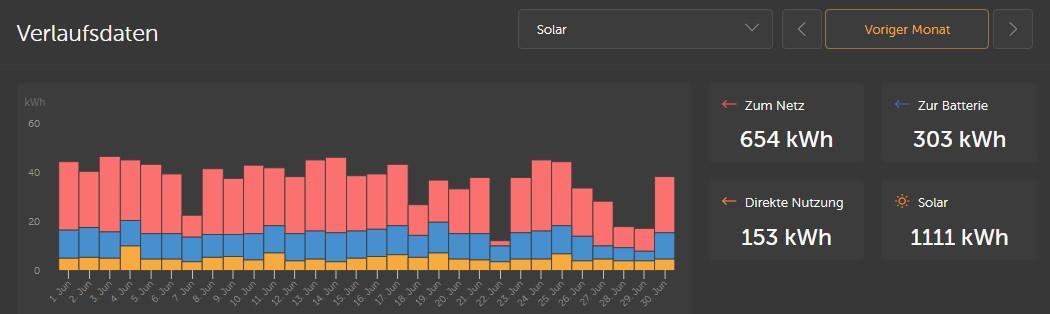 da hatte ich mal was gerechnet... die werte von victron connect bzw, die werte im GX für den RS450 sind mmn auf stringebene. im VRM und GX übersichtsseite kommt weniger an. das waren bei hoher leistung so 95-96%. bei niedriger leistung hab ich schon mehr gesehen. auch im VRM dashboard ist die summe der 4 strings immer höher, als die ausgangsleistung. mach mal connect , console und VRM nebeneinander auf. ob die werte ehrlich sind, kann ich natürlich nicht sagen, aber das würde dem werbeversprechen von 96% beim RS schon nahe kommen. vielleicht doch, bzw in kombination. vermutung: der eigenverbrauch vom system könnte/müsste in den batterieverlusten drin sein. wie man jetzt den multi,cerbo etc da raus rechnet... wieviel das haus jetzt verbraucht, kann ich ja nicht mehr am EVU-zähler sehen, sondern muss auf den EM24 am cerbo vertrauen. am EVU-zähler kann ich aber die einspeisung vergleichen und das kommt bis auf wenig rundung und das 15minutenintervall beim zähler schon ganz gut hin. so sollte der gesamtverbrauch vom haus recht genau dem angezeigten wert im VRM (EM24/GX) entsprechen. passt auch mit dem vorjahresverbrauch etwa. damit sollte meine rechnung oben garnicht so falsch sein. werde das später nochmal kontrollieren und den Zähler nochmal ablesen und mal die letzten zwei tage vergleichen. den RS450 rechne ich dann auch nochmal rein. genau. nur hatte ich oben mit 88 gerechnet. muss ich gleich nochmal nachvollziehen. war ein bisschen unübersichtlich, weil ich einmal den exakten monat und einmal den "ablesemonat" gepostet hatte... danke für dein mitgrübeln. |