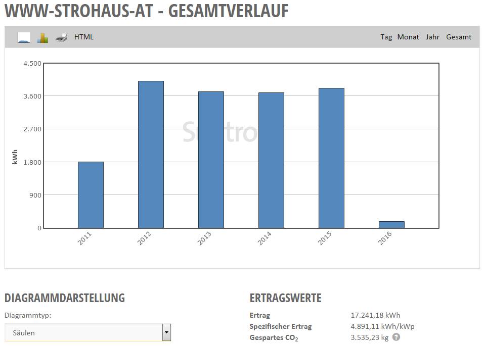 ich zähle nicht im kalenderjahr, sondern ab errichtung im frühjahr synchron mit der stromabrechnung. hier wären die werte nach kalenderjahr, wobei im ersten jänner, februar fehlen... 5156 kwh 5431 kwh 5024 kwh 5144 kwh die anlage hat 5,1kwp, 26° dachneigung, 50° südost schott monomodule, kostal wechselrichter, 2 strings angesichts der schwierigen lage bin ich mehr als zufrieden ... hab ähnliche träume wie du, dritter string auf südwest, im endausbau ein windrad hoch über unserem einwintergartenalsloggiaoberflächenkühlrippenminimierungsdavorstell-konstrukt ... |
