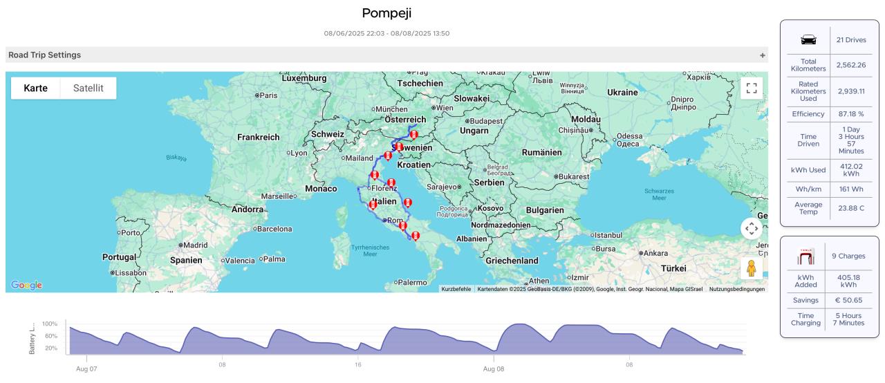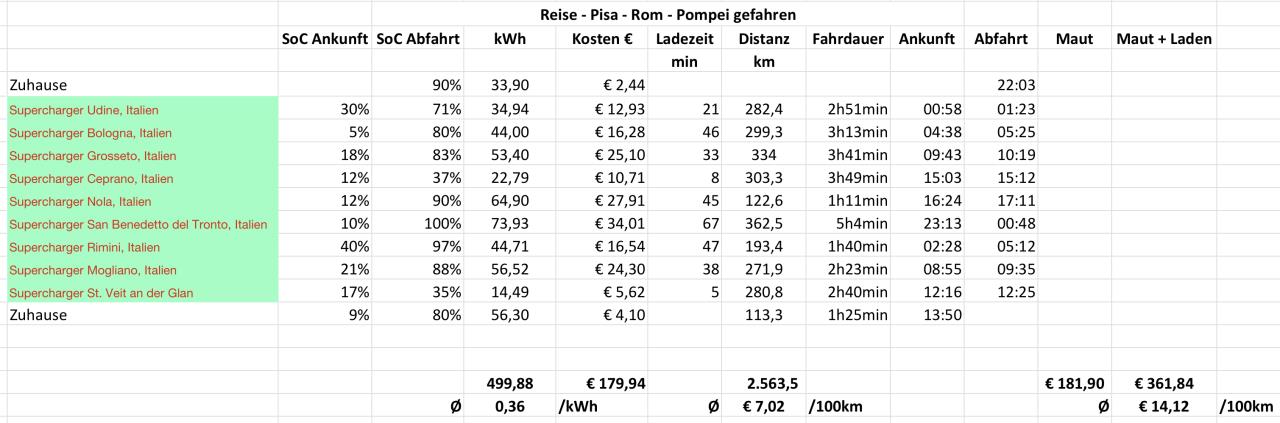 Wenn ich richtig gerechnet habe, hast du laut deiner Tabelle bei diesem Roadtrip 20,5kWh/100km verbraucht. Der screenshot vom Tesla zeigt aber 17kWh/100km. Kommt mir für die reinen Ladeverluste relativ hoch vor.